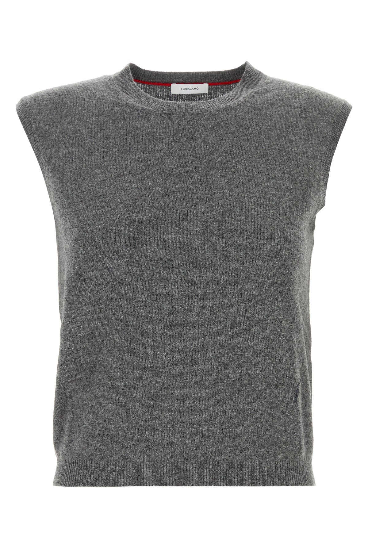 Vest realized in stretch cashmere blend characterized by tonal embroidered logo not he hemline. - Ribbed crew-neck, cuffs and hemline DETAILS Grey stretch cashmere blend vest Exterior: 97% Cashmere 2% Nylon 1% Elastane Made in italy Sample size: S