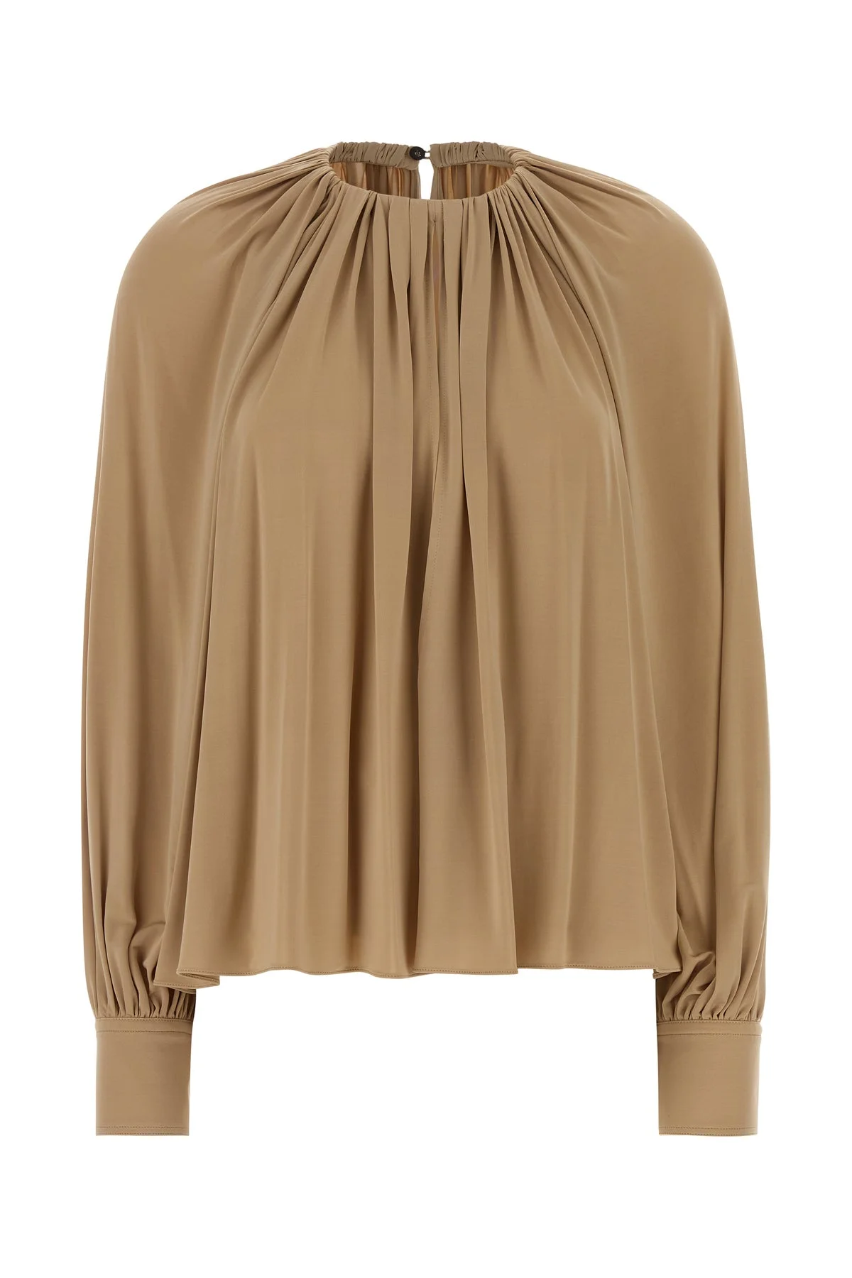 Blouse realized in stretch viscose jersey characterized by gatherings. - Crew-neck - Cut-out detail at the front - Concealed button closure at the back - Opening at the back - Buttoned cuffs DETAILS Skin pink jersey blouse Exterior: 93% Viscose 7% Elastane Made in italy Sample size: 38
