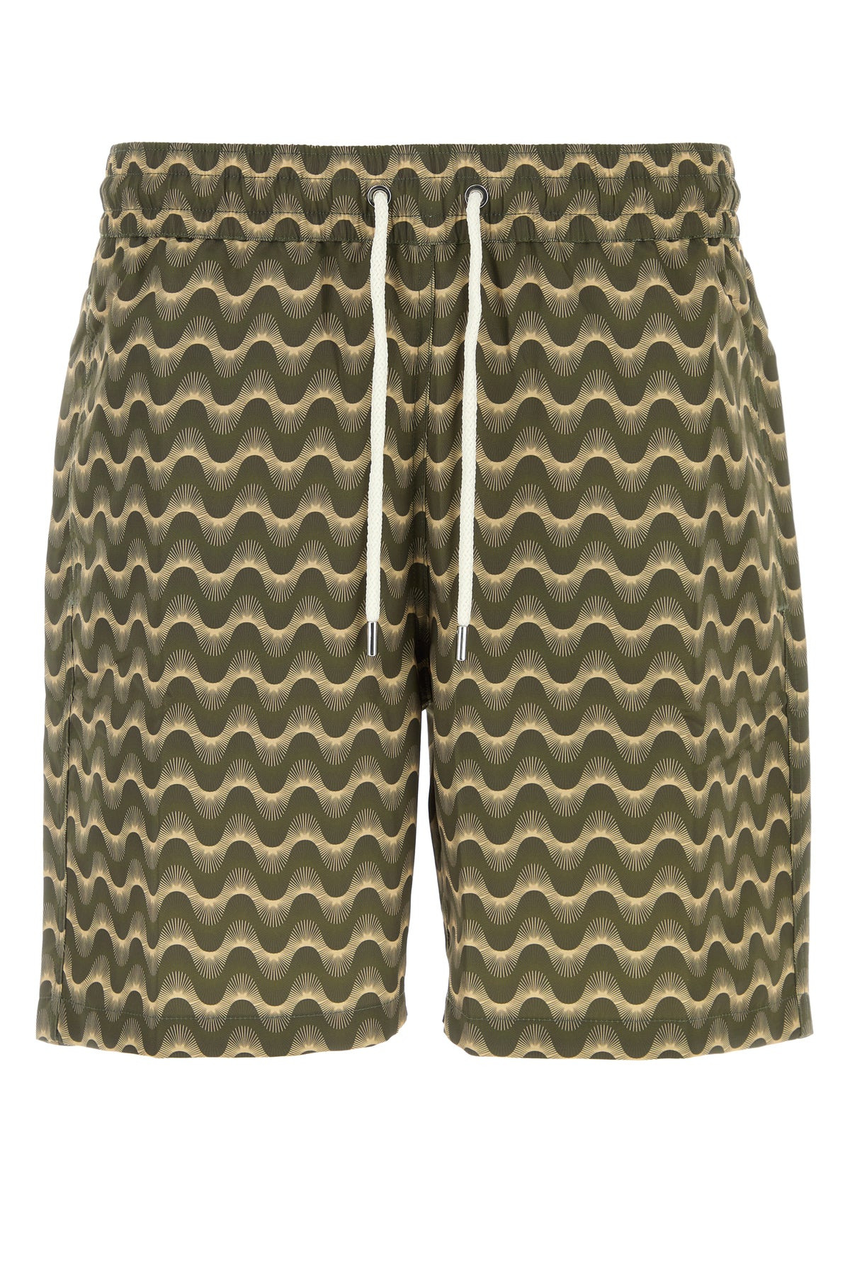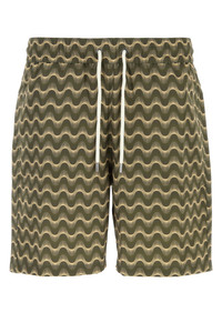 Swimming shorts realized in recycled polyester characterized by peculiar print on the entire surface. - Elastic waist with drawstring - Seam pockets and a patch pocket at the back - Partially mesh lined DETAILS Printed polyester Santos swimming shorts Exterior: 100% Recycled polyester Lining: 100% Recycled polyester Made in portugal Sample size: M