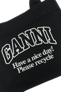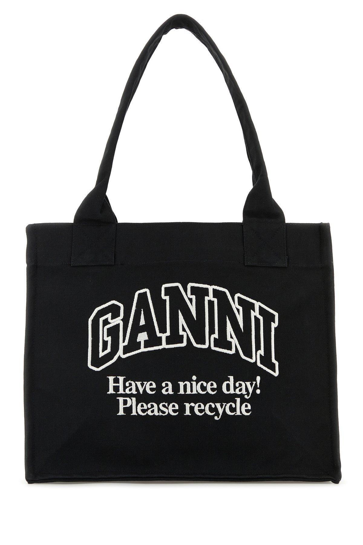 Shopping bag realized in canvas characterized by contrasting embroidered logo at the front. - Two fabric flat handles - Lined interior with two slit pockets and a zip pocket DETAILS Black canvas shopping bag Exterior: 100% Fabric Made in india Width: 37 cm Height: 31 cm Depth: 17 cm Handle height: 25 cm