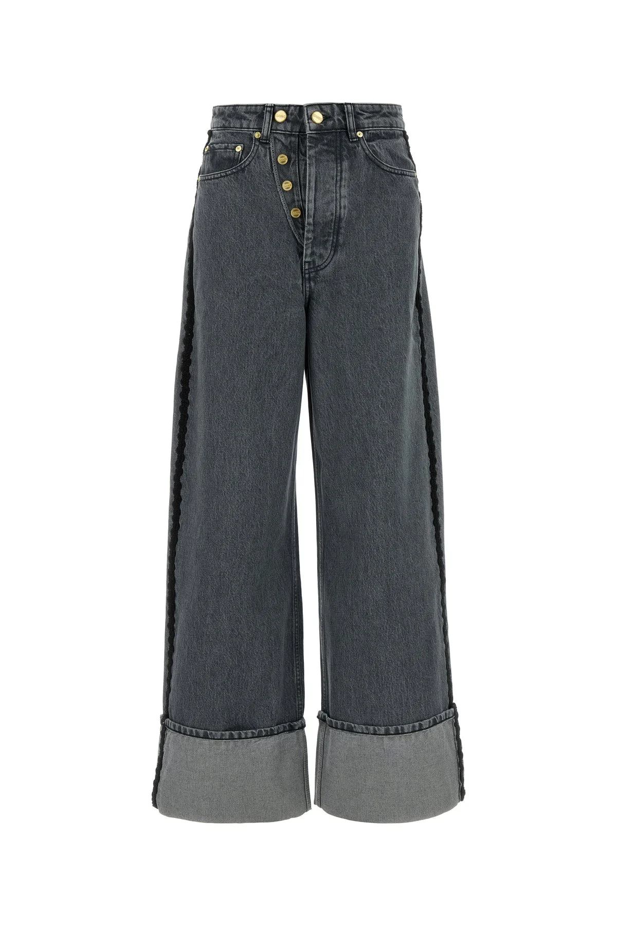 Baggy jeans realized in stonewashed pure organic cotton denim enriched by lace inserts on the sides. - Belt loops at the waist - Double closure by concealed buttons and a single visible button - Five classic pockets - Folded cuffs - Logoed label at the back DETAILS Black denim jeans Exterior: 100% Organic cotton Made in turkiye Sample size: 26