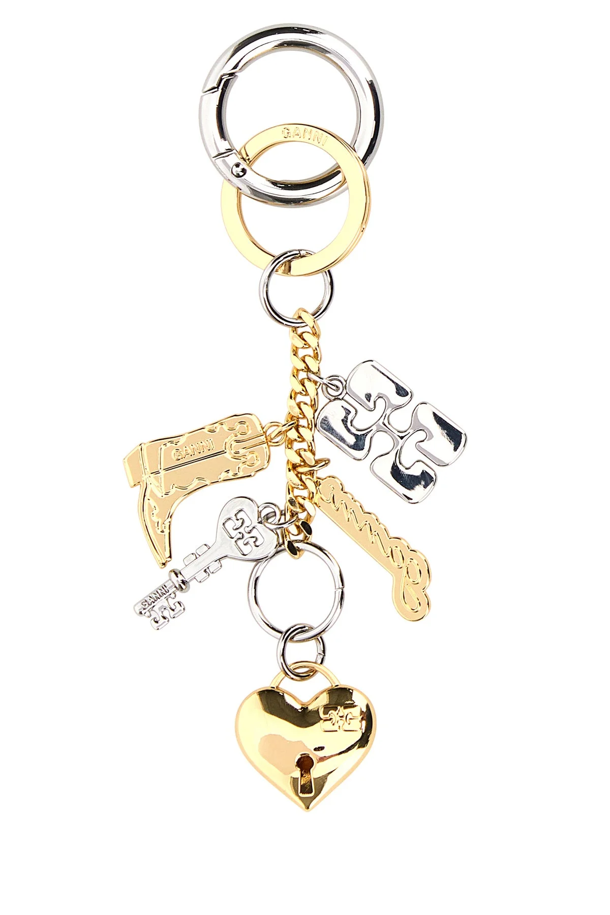Keyring realized in metal enriched by charms. DETAILS Two-tone metal key ring Exterior: 100% Metal Made in Width: 3 cm Height: 14 cm