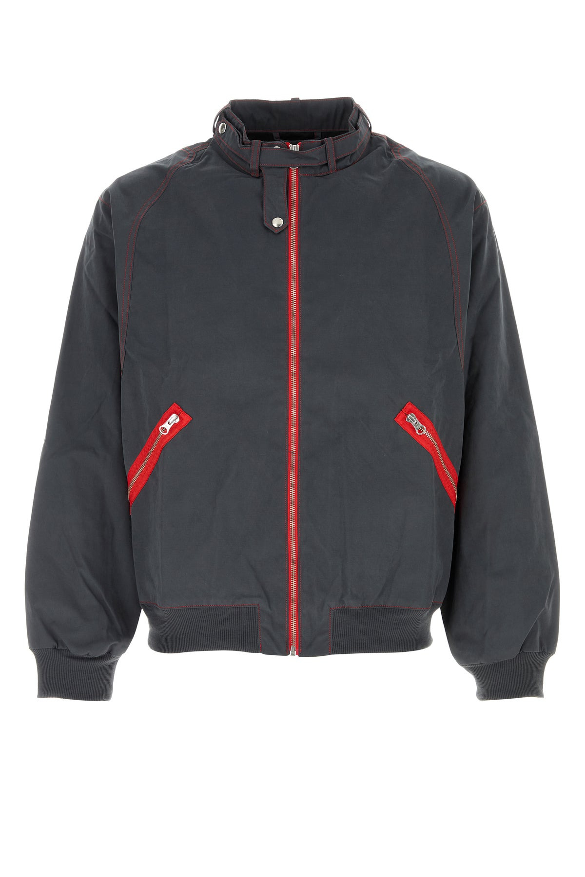 Bomber jacket realized in polyester blend characterized by contrasting stitchings. - High collar - Zip closure - Two zip pockets at the front - Ribbed cuffs and hemline - Lined DETAILS Charcoal polyester blend bomber jacket Exterior: 52% Polyester 38% Cotton 10% Nylon Lining: 100% Fabric Made in portugal Sample size: M