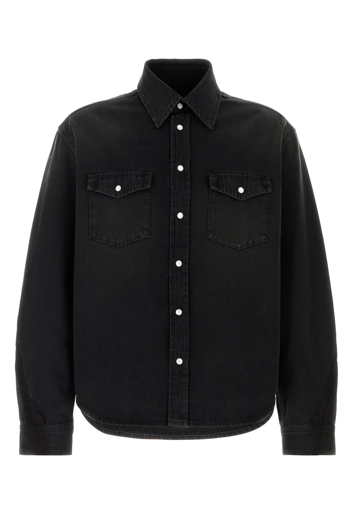Shirt realized in pure cotton denim enriched by leather Givenchy Paris label at the back. - Short-pointed collar - Snap buttons closure - Chest pockets - Buttoned angle cuffs - Rear yoke DETAILS Black denim shirt Exterior: 100% Cotton Made in italy Il modello e alto 190 cm e indossa la taglia M