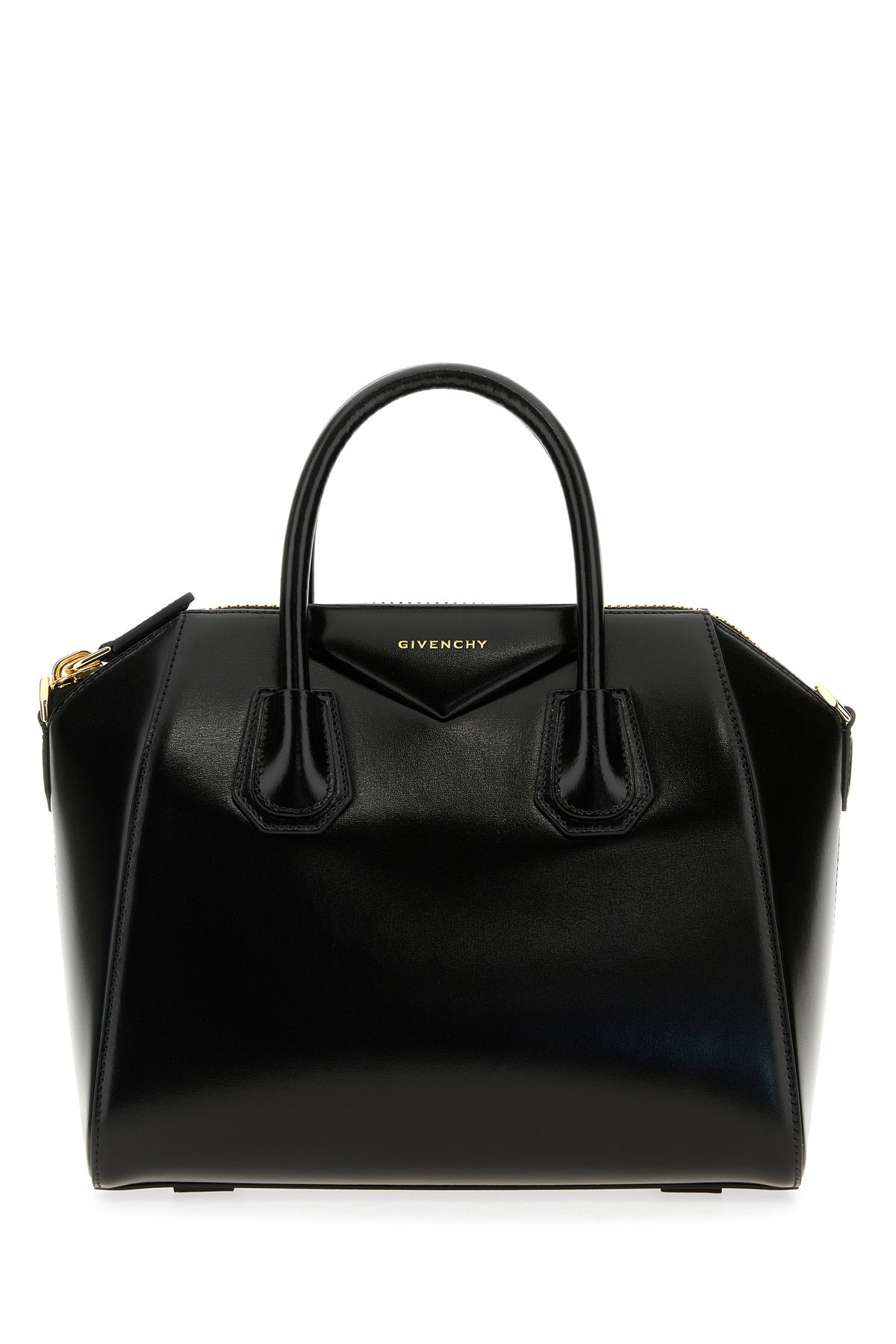 Handbag realized in smooth calf leather enriched by metal lettering logo at the front. - Two round tonal leather handles - Detachable tonal leather shoulder strap - Zip closure - Lined interior with two patch pockets and a zip pocket DETAILS Black leather small Antigona handbag Exterior: 100% Calf Lining: 100% Cotton Finishing: Golden metal Made in italy Width: 28 cm Height: 24 cm Depth: 19 cm Handle height: 9 cm Shoulder strap length: 32 cm