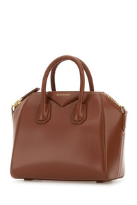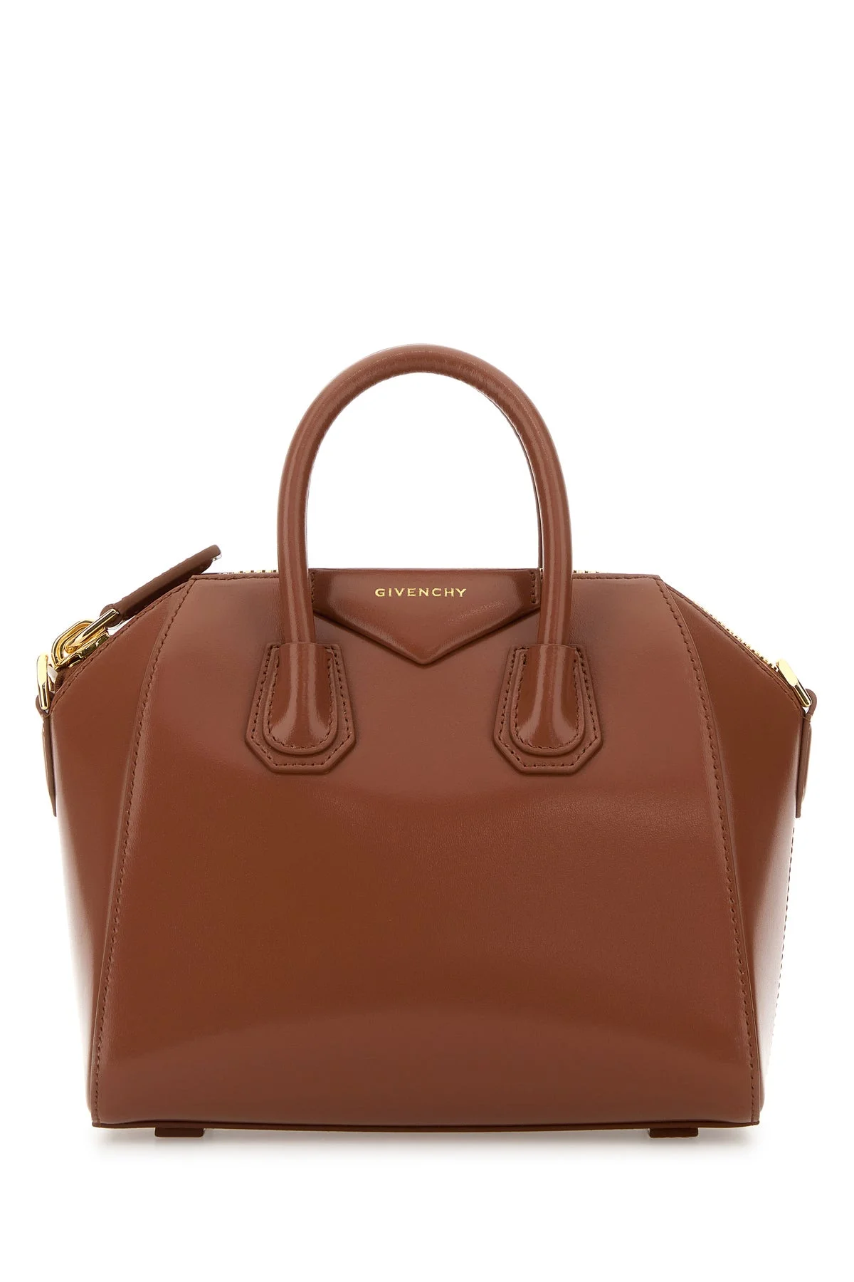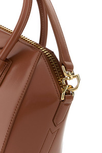 Handbag realized in smooth calf leather characterized by laminated printed logo at the front. - Two tonal leather round handles - Adjustable detachable tonal leather shoulder strap - Zip closure - Lined interior with a zip pocket DETAILS Caramel leather mini Antigona handbag Exterior: 100% Calf Lining: 90% Cotton 10% Polyester Finishing: Golden metal Made in italy Width: 26 cm Height: 19 cm Depth: 13 cm Handle height: 6 cm Min shoulder strap length: 43 cm Max shoulder strap length: 55 cm