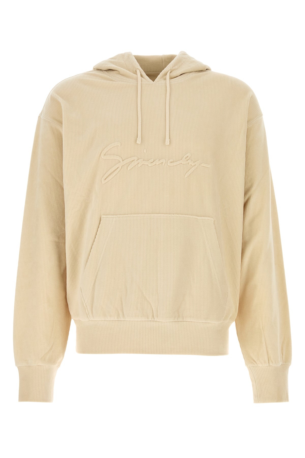 Sweatshirt realized in stretch corduroy characterized by logo in relief on the chest. - Drawstring hood - Pouch pocket - Ribbed cuffs and hemline DETAILS Cream stretch corduroy sweatshirt Exterior: 86% Cotton 12% Nylon 2% Elastane Made in portugal Sample size: M
