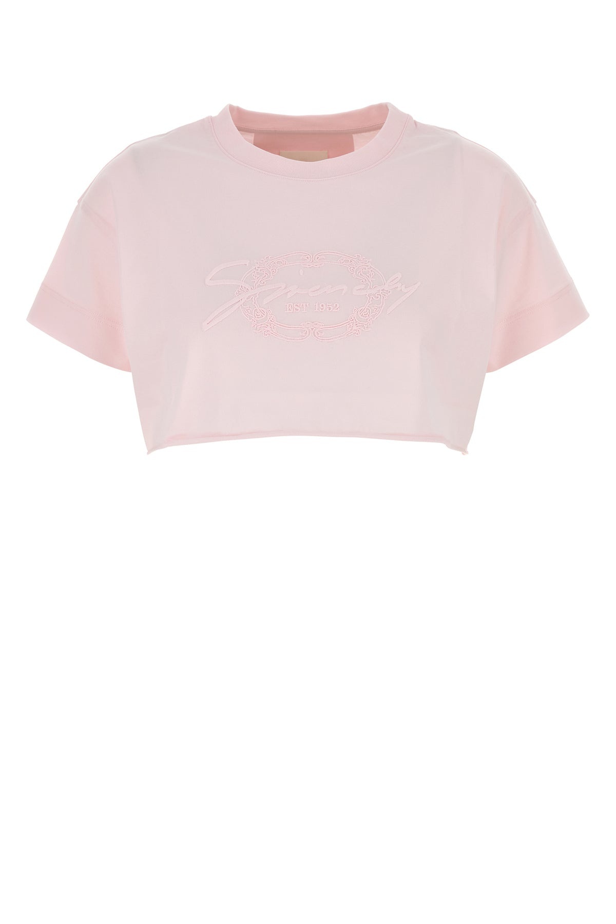 Crop-top realized in pure cotton characterized by tonal embroidered logo on the chest. - Ribbed crew-neck DETAILS Pastel pink cotton crop-top Exterior: 100% Cotton Made in italy Sample size: XS