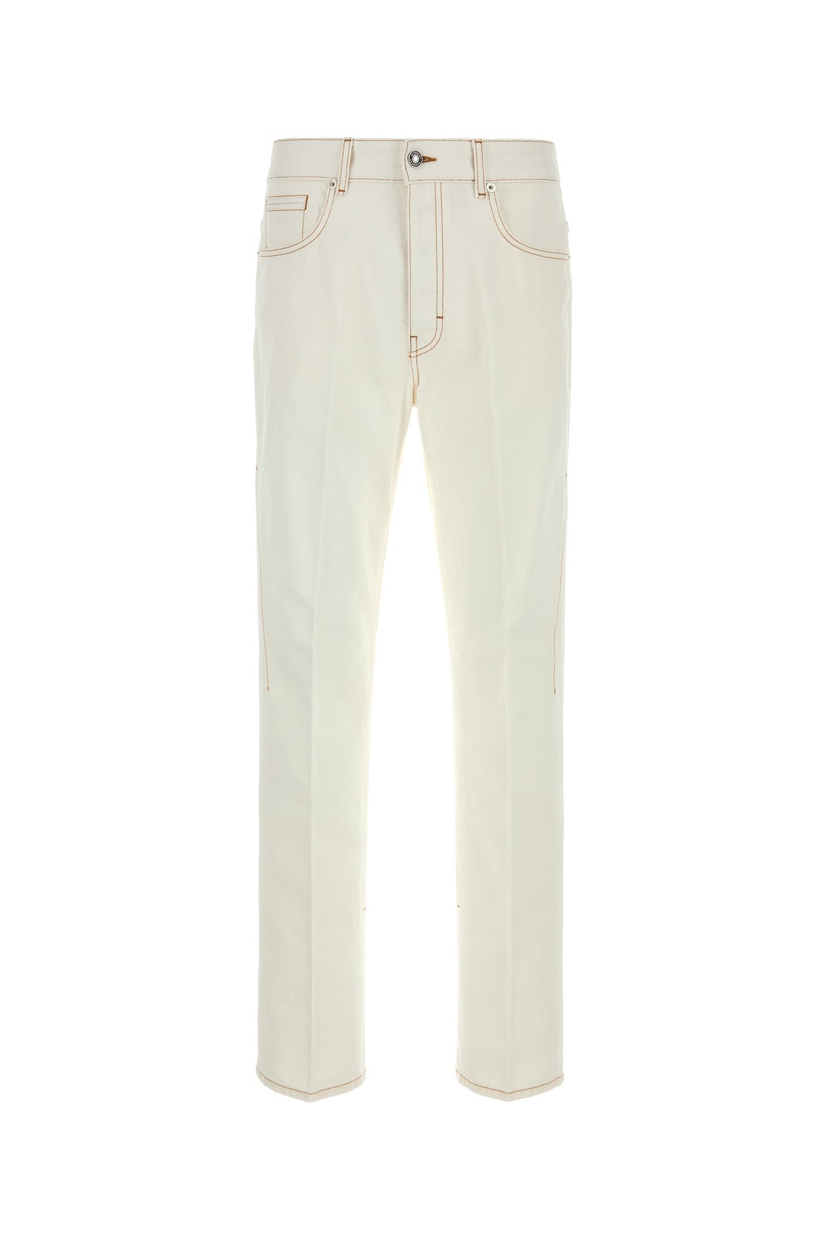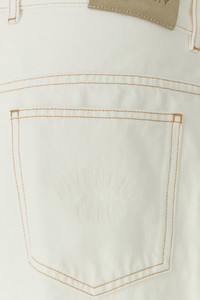 Jeans realized in pure cotton denim charactered by tonal embroidered logo at the back. - Belt loops at the waist - Concealed buttons and single visible button closure - Central ironed pleats - Contrasting logoed label at the back DETAILS White denim jeans Exterior: 100% Cotton Made in italy Model is 190 cm and is wearing a size 32