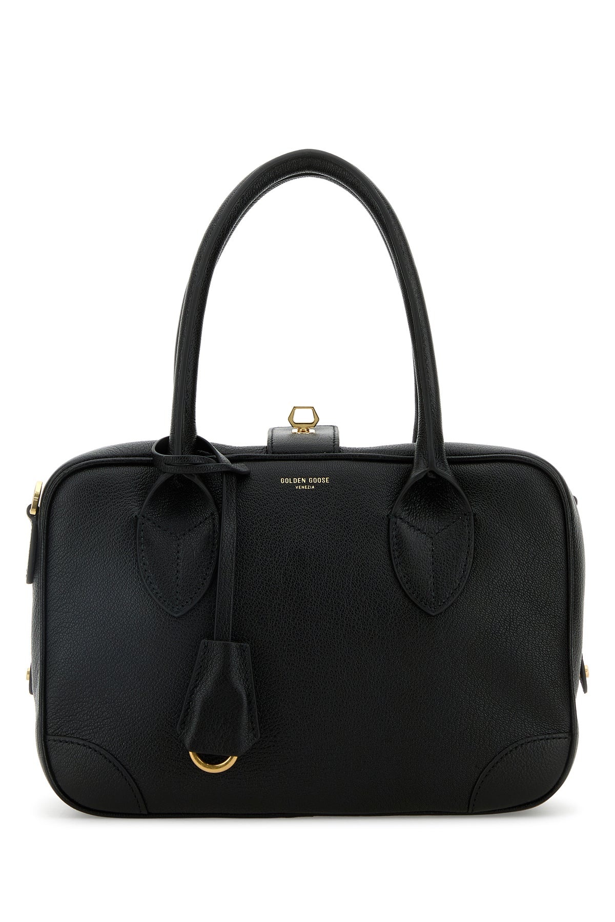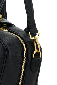 Handbag realized in slightly pebble ovine leather characterized by laminated printed logo at the front enriched by detachable keyring accessory. - Two tonal leather round handles - Adjustable detachable tonal leather shoulder strap - Snap-fit closure and zip closure at the top - Lined interior with a zip pocket and two patch pockets - Protective metal feet at the base DETAILS Black leather Vita handbag Exterior: 100% Ovine leather Lining: 100% Fabric Finishing: Golden metal Made in italy Width: 26 cm Height: 17,5 cm Depth: 10 cm Handle height: 14 cm Min shoulder strap length: 49 cm Max shoulder strap length: 55 cm