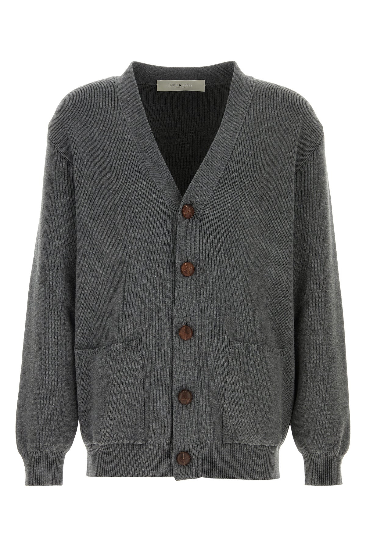 Cardigan realized in cotton blend enriched by contrasting Golden patch and metal Half Star details at the back. - V neckline - Buttons closure - Two patch pockets at the front - Ribbed trimmings DETAILS Dark grey cotton blend Darryl cardigan Exterior: 96% Cotton 3% Nylon 1% Elastane Made in italy Sample size: M
