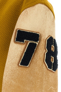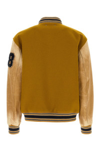 Bomber jacket realized in pure virgin wool with vintage-effect leather sleeves enriched by logoed patch on the chest and metal Half Star details at the back. - Ribbed collar, cuffs and hemline - Snap buttons closure - Two slit pockets at the front - Lined DETAILS Ochre wool Aleandro bomber jacket Exterior: 100% Virgin wool 100% Ovine leather Lining: 54% Acetate 46% Viscose Made in italy Sample size: 48