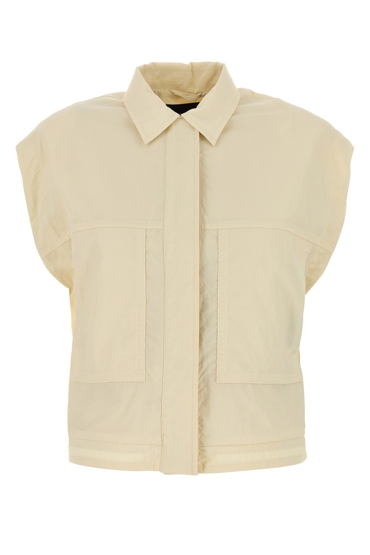 Vest realized in nylon characterized by collar. - Concealed buttons closure - Two patch pockets at the front - Lateral openings with buttons - Drawstring on the hemline - Mesh lined interior with a patch pocket DETAILS Cream nylon vest Exterior: 100% Nylon Lining: 100% Polyester Made in moldova Sample size: 38