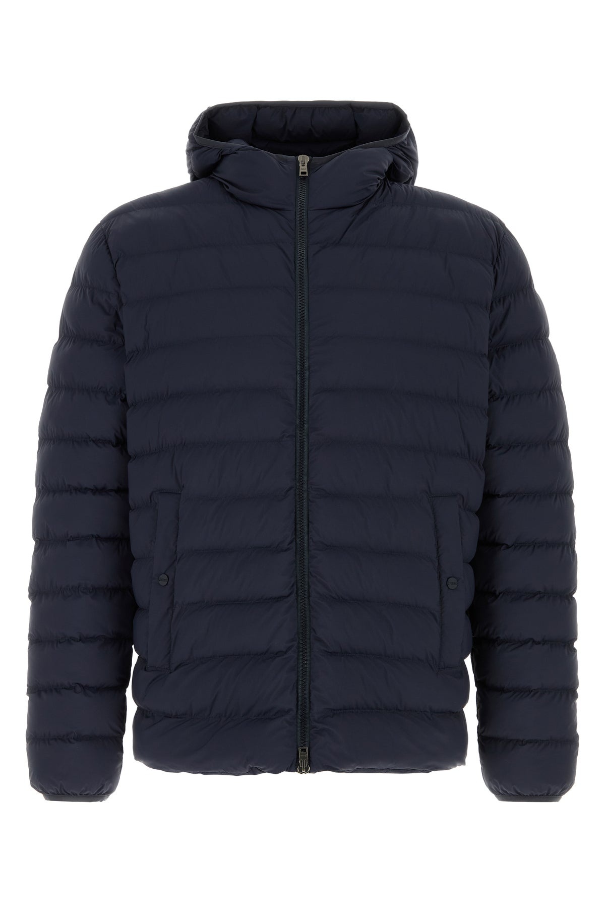 Jacket realized in quilted stretch nylon characterized by hood. - Zip closure - Two slit pockets at the front - Elastic cuffs - Drawstring on the hemline - Lined interior with a zip pocket DETAILS Navy blue stretch nylon jacket Exterior: 86% Nylon 14% Elastane Lining: 86% Nylon 14% Elastane Padding: 100% Polyester Made in moldova Sample size: 48