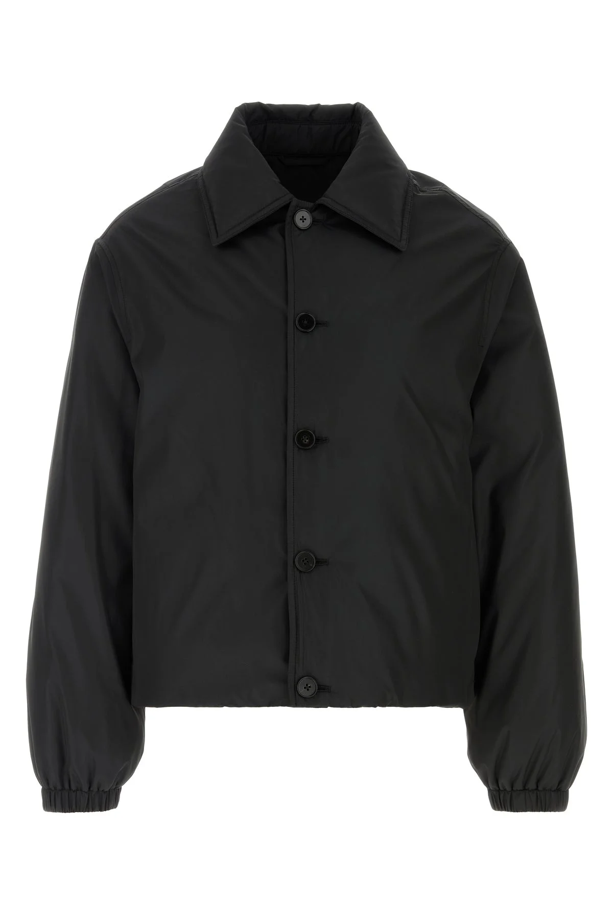 Padded jacket realized in polyester characterized by collar. - Buttons closure - Seam pockets - Elastic cuffs - Drawstring on the hemline - Lined DETAILS Black polyester padded jacket Exterior: 100% Polyester Lining: 100% Polyester Padding: 100% Polyester Made in italy Sample size: 48