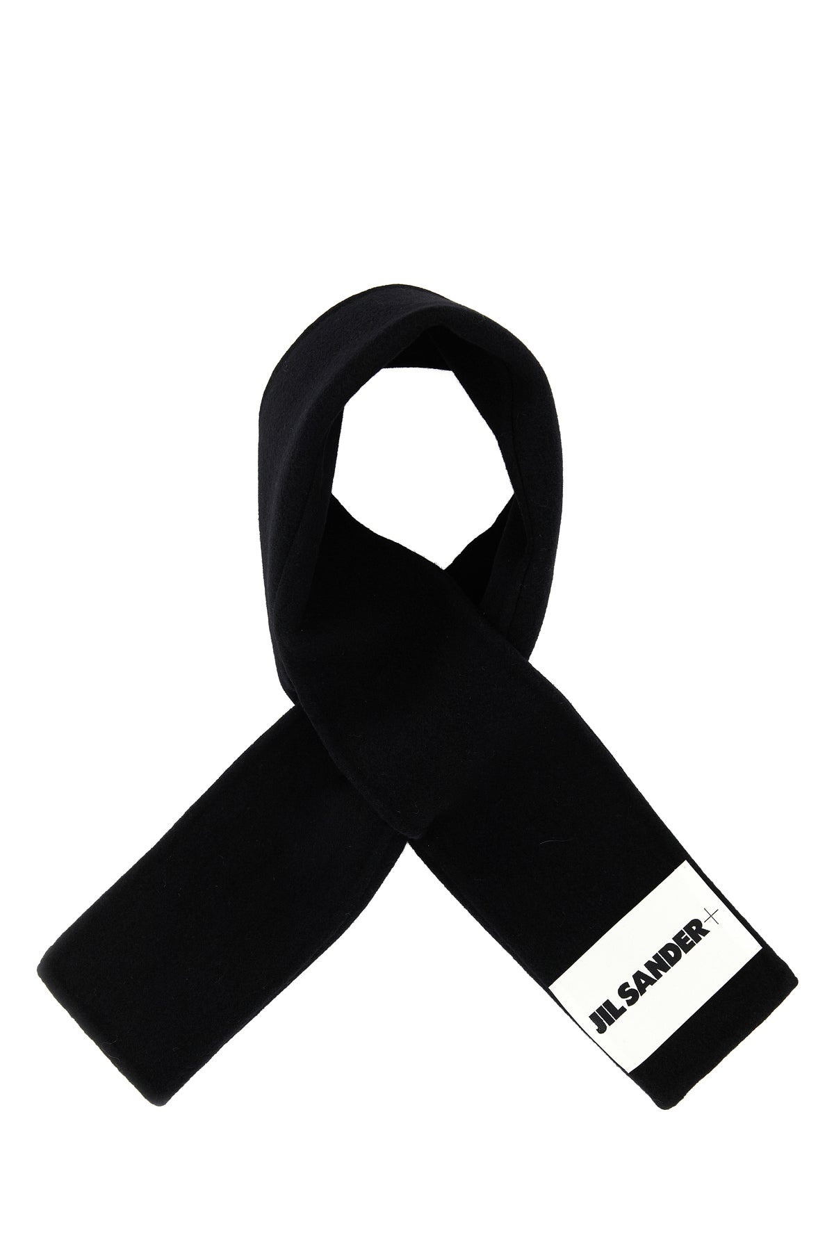Scarf realized in pure virgin wool enriched by contrasting logoed label on the hemline. - Cut-out detail DETAILS Black wool scarf Exterior: 100% Virgin wool Made in italy Width: 120 cm Height: 25 cm