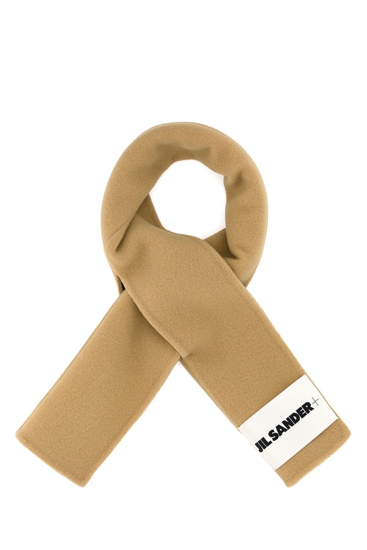 Scarf realized in pure virgin wool enriched by contrasting logoed label on the hemline. - Cut-out detail DETAILS Camel wool scarf Exterior: 100% Virgin wool Made in italy Width: 120 cm Height: 25 cm
