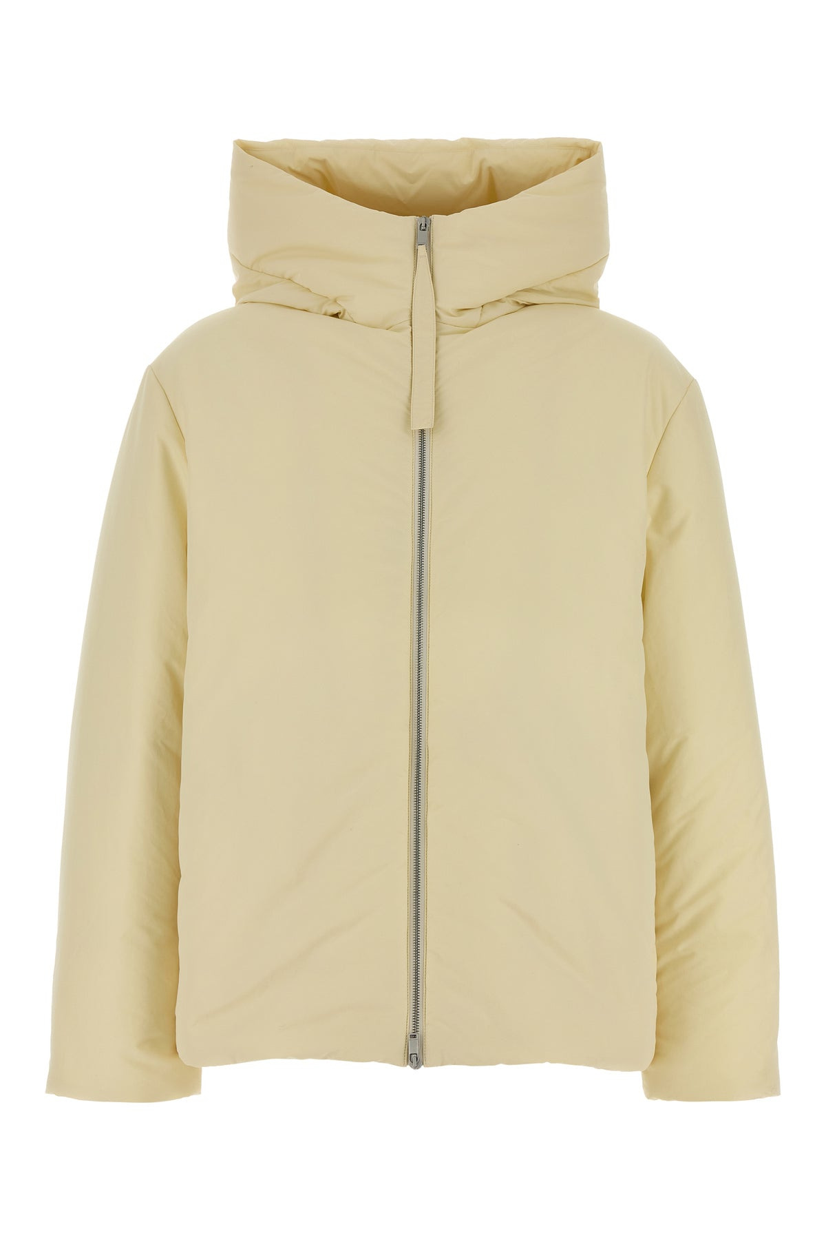 Down jacket realized in polyester characterized by hood. - Zip closure - Two slit pockets at the front - Drawstring on the hemline - Lined interior with two patch pockets DETAILS Cream polyester down jacket Exterior: 100% Polyester Lining: 100% Polyester Padding: 85% Down 15% Feather Made in italy Sample size: M