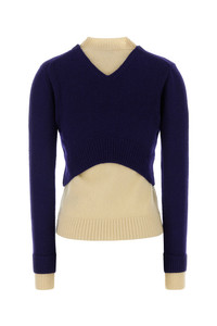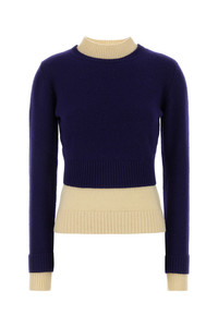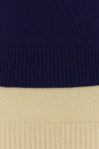 Layered sweater realized in virgin wool blend. - Ribbed crew-neck, cuffs and hemline - Contrasting trimmings DETAILS Navy blue wool blend sweater Exterior: 98% Virgin wool 2% Nylon Made in italy Sample size: 40