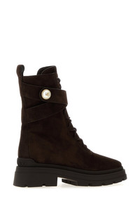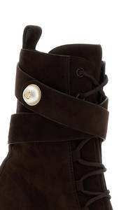 Boots realized in suede characterized by logo in relief on the heel enriched by logoed jewel patch on the side. - Round toe - Laces to tie and zip closure - Heel pull-tab - Logoed label on the inside DETAILS Dark brown suede Noemi boots Exterior: 100% Suede Interior: 100% Leather Sole: Rubber Made in italy