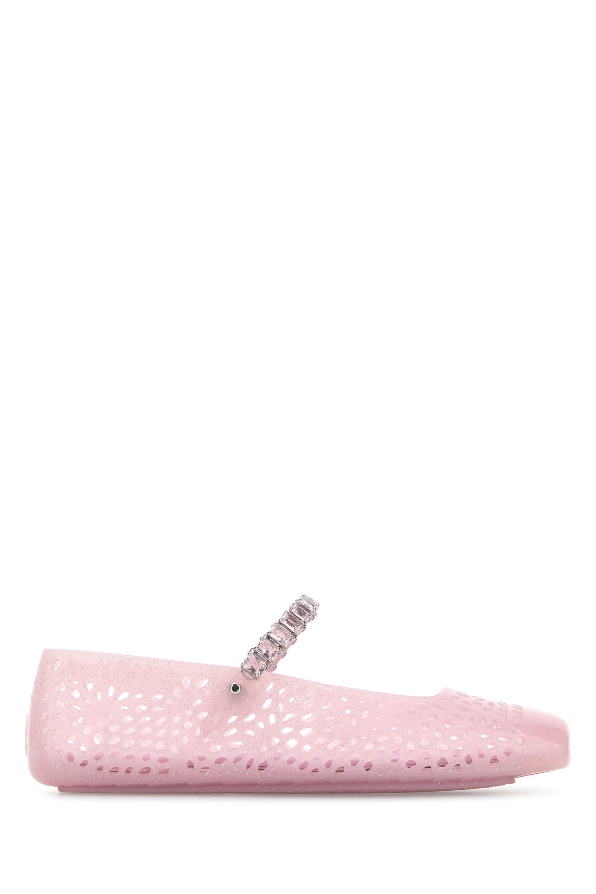 Ballerinas realized in rubber characterized by glitter on the entire surface enriched by rhinestones on the adjustable strap on the instep. - Squared toe - Logo in relief on the side - Logo in relief on the inside DETAILS Pink rubber The Jelly ballerinas Exterior: 100% Rubber Interior: 100% Rubber Sole: Rubber Made in china
