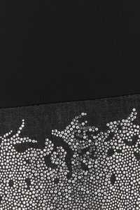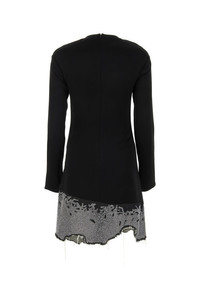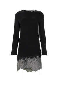 Dress realized in triacetate blend with pure cotton denim insert on the hemline enriched by rhinestones on the hemline. - Round neckline - Concealed zip closure at the back - Long sleeves - Distressed hemline - Unlined DETAILS Exterior: 86% Triacetate 14% Polyester Made In Italy Sample size: 6