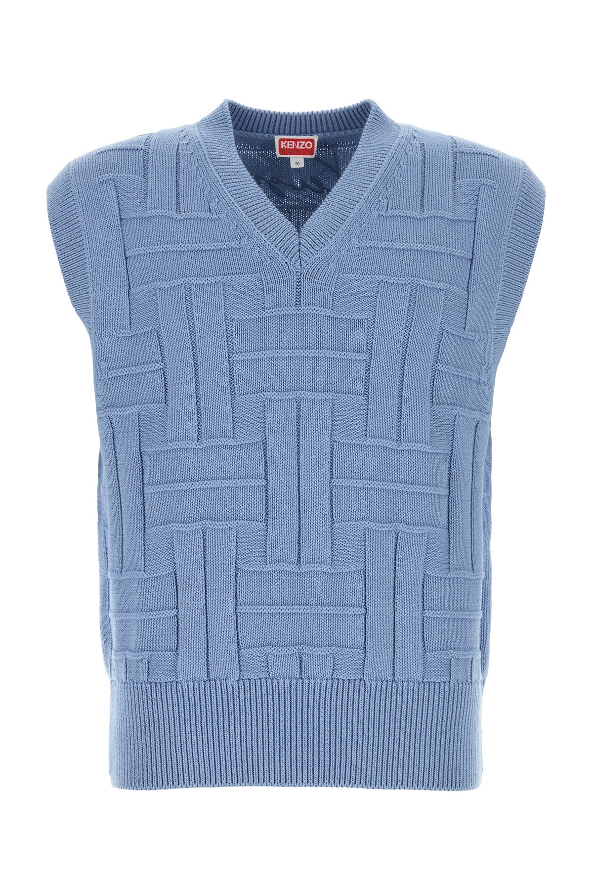 Vest realized in pure cotton characterized by Kenzo Weave embroidery on the entire surface and tonal embroidered logo at the back. - Ribbed V neckline, arm holes and hemline DETAILS Cerulean blue cotton vest Exterior: 100% Cotton Made in turkiye Sample size: M