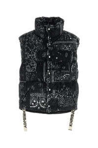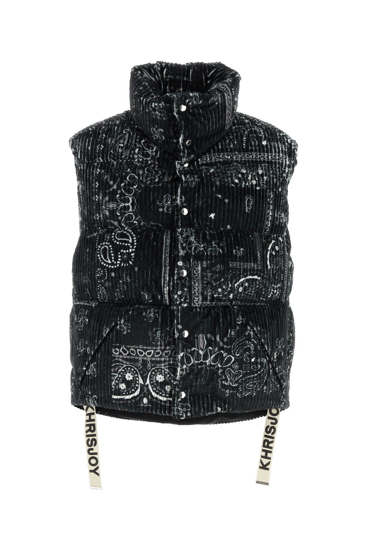 Oversize sleeveless down jacket realized in quilted pure cotton corduroy characterized by peculiar print on the entire surface enriched by logoed fabric laces on the hemline. - High neck - Buttons closure at the front - Two slit pockets at the front - Lined DETAILS Exterior: 100% Cotton Lining: 100% Polyester Padding: 80% Down 20% Feathers Made In Italy Sample size: 1