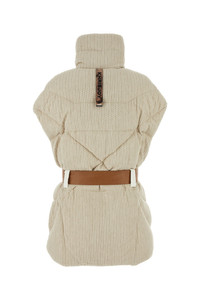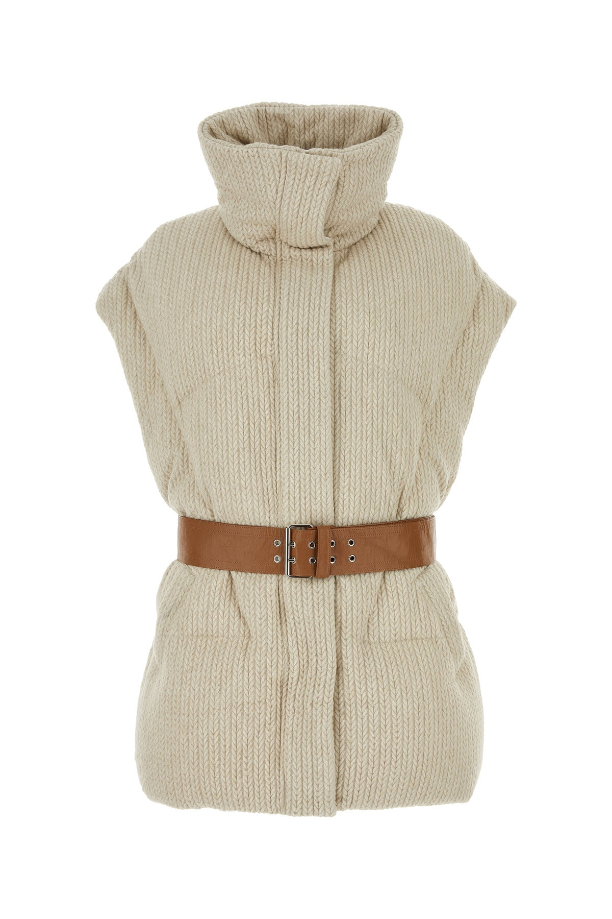 Sleeveless down jacket realized in knit enriched by logoed label at the back and detachable leather belt with metal buckle. - Funnel neck - Concealed zip and buttons closure - Two slit pockets at the front - Belt loops at the waist - Lined DETAILS Exterior: 100% Modal 30% Polyester 20% Nylon Lining: 100% Polyester Padding: 80% Down 20% Feather Made In Italy Sample size: 1