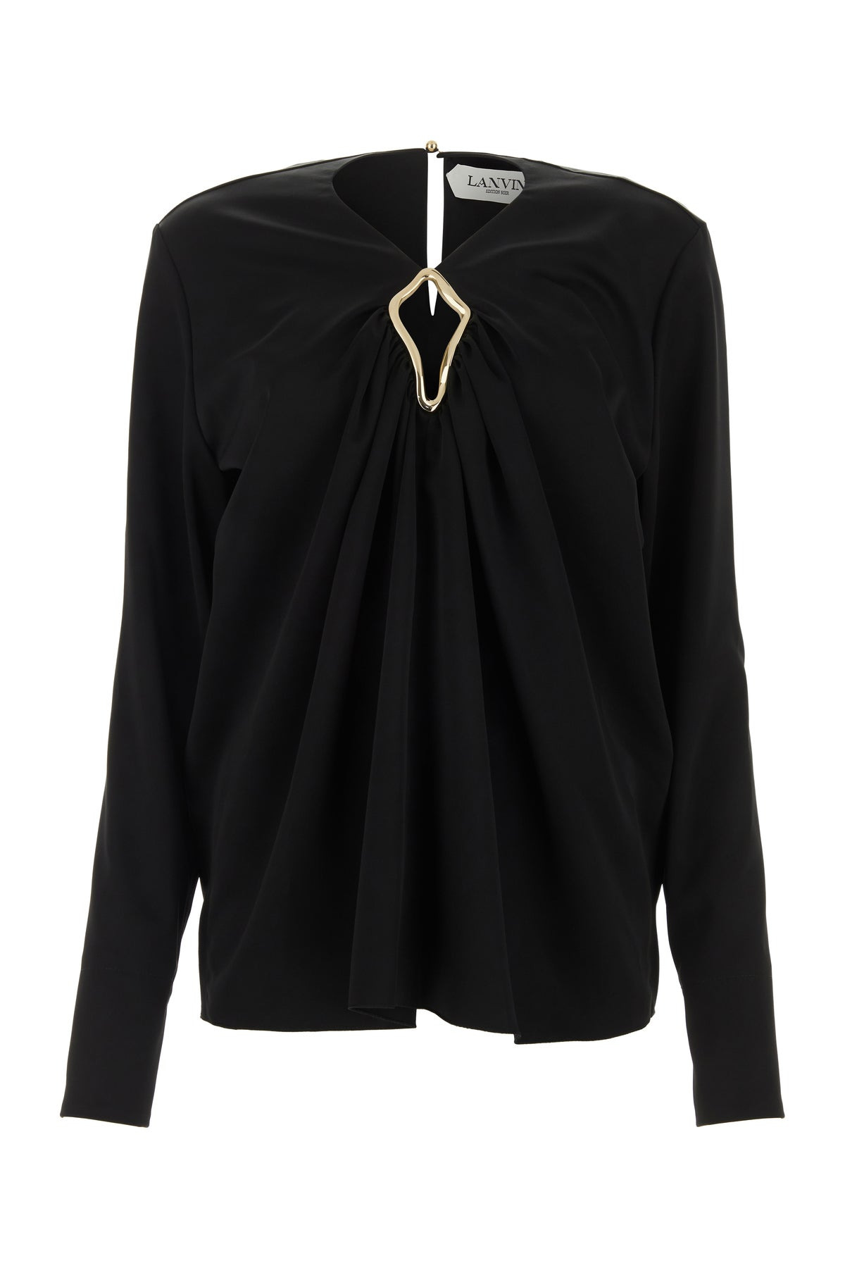Blouse realized in triacetate blend characterized by cut-out detail at the front enriched by peculiar metal detail at the front. - V neckline - Long sleeve - Jewel buttoned cuffs DETAILS Exterior: 63% Triacetate 37% Polyester Made In Spain Sample size: 38
