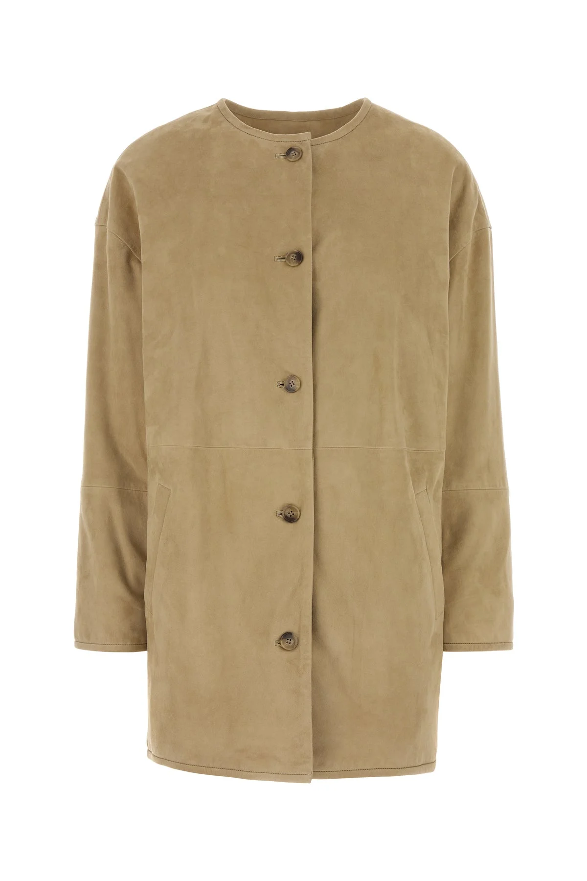 Jacket realized in lamb suede characterized by crew-neck. - Buttons closure - Two slit pockets at the front - Lined interior with a slit pocket DETAILS Beige suede Waren jacket Exterior: 100% Lamb Lining: 100% Viscose Made in turkiye Sample size: 38