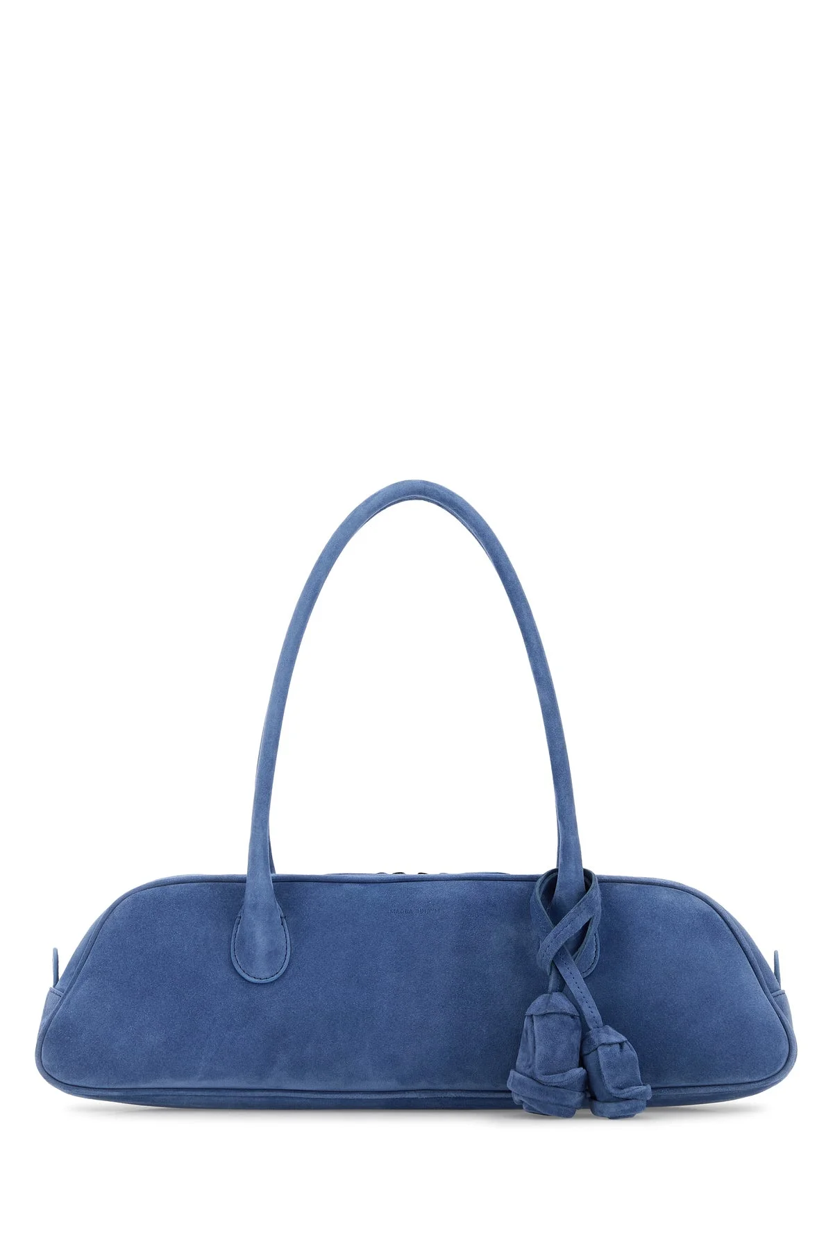 Shoulder bag realized in suede characterized by embossed logo at the front enriched by detachable floral patch. - Two leather round handles - Zip closure - Lined interior with a patch pocket DETAILS Cerulean blue suede shoulder bag Exterior: 100% Suede Lining: 100% Fabric Finishing: Silver metal Made in italy Width: 40 cm Height: 13 cm Depth: 7 cm Handle height: 20 cm
