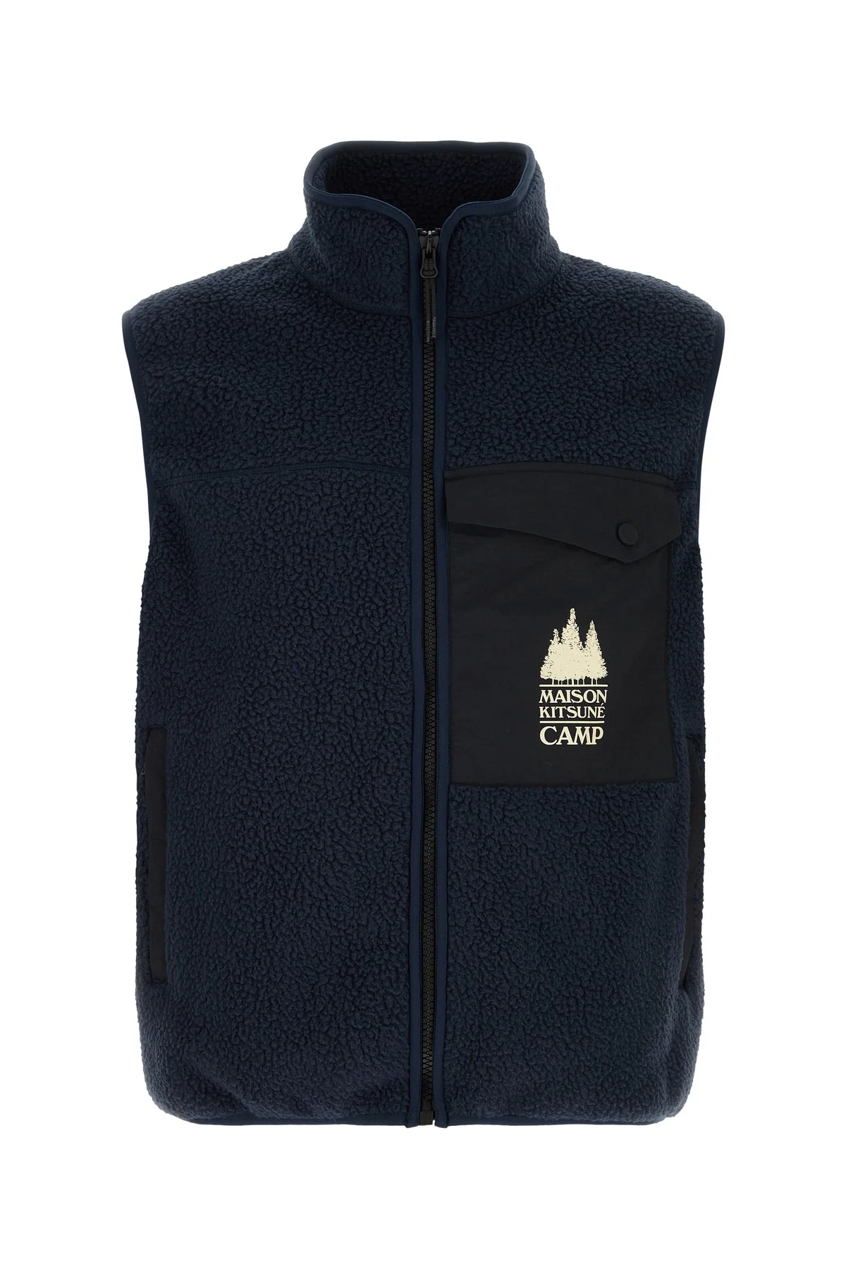 Sleeveless jacket realized in pile with tonal tech fabric inserts characterized by Maison Kitsune Camp print on the chest. - High neck - Zip closure - Chest pocket and two zip pockets at the front - Unlined DETAILS Navy blue pile sleeveless jacket Exterior: 100% Polyester Made in china Sample size: M