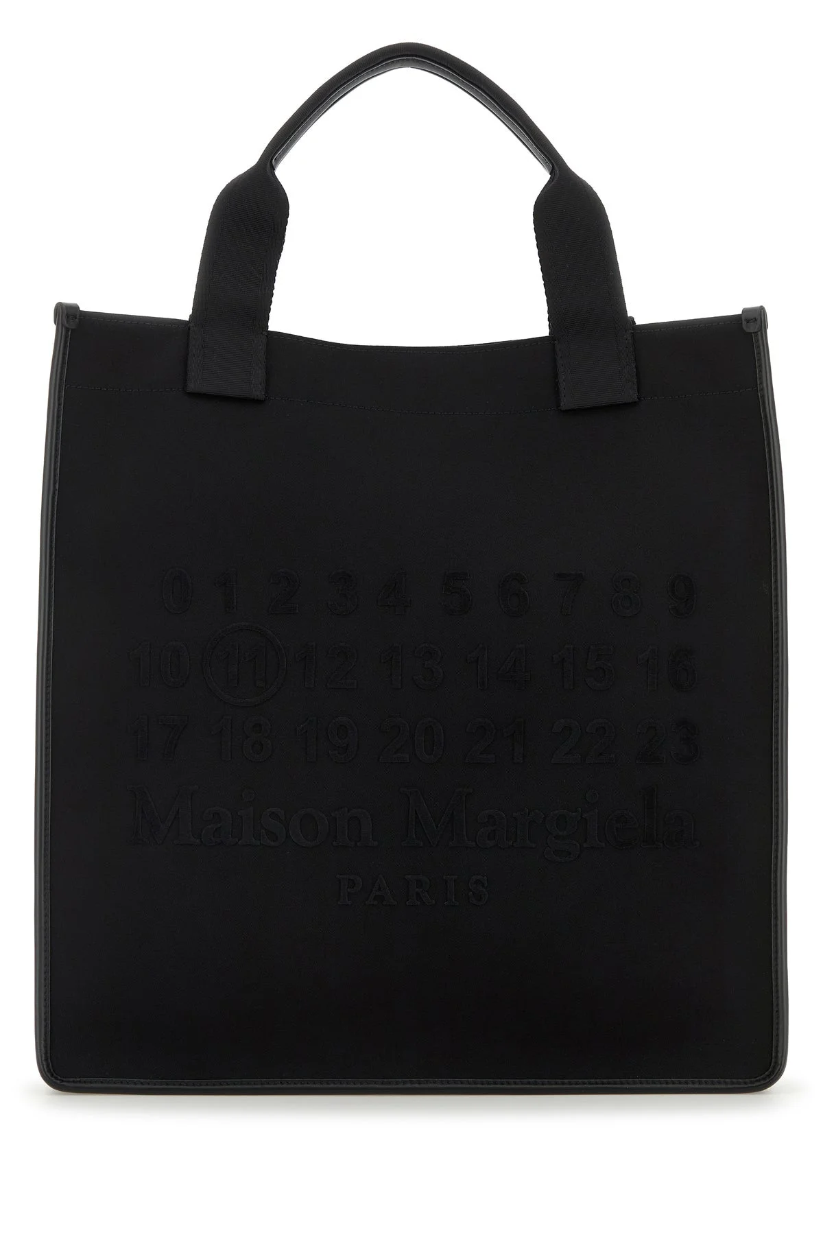 Shopping bag realized in canvas with suede inserts on the sides characterized by flocked print logo at the front. - Two fabric and leather flat handles - Two fabric flat handles - Magnetic button closure - Unlined interior with a patch pocket and a zip pocket DETAILS Black canvas shopping bag Exterior: 100% Fabric 100% Suede Finishing: Silver metal Made in italy Width: 38 cm Height: 40 cm Depth: 12 cm Handle height 1: 13 cm Handle height 2: 26 cm