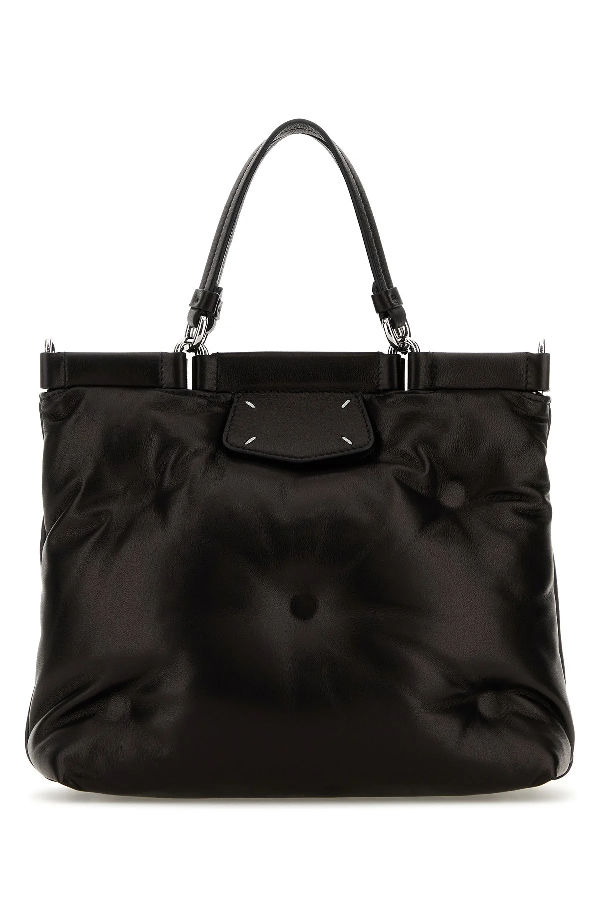 Handbag realized in leather characterized by iconic contrasting stitching at the front. - Two-leather flat handles - Adjustable detachable tonal leather shoulder strap - Magnetic button closure - Lined interior with a zip pocket - Protective metal feet at the base DETAILS Black leather handbag Exterior: 100% Leather Lining: 100% Fabric Finishing: Silver metal Made in italy Width: 26 cm Height: 24 cm Depth: 11 cm Handle height: 10 cm Min shoulder strap length: 30 cm Max shoulder strap length: 50 cm
