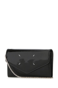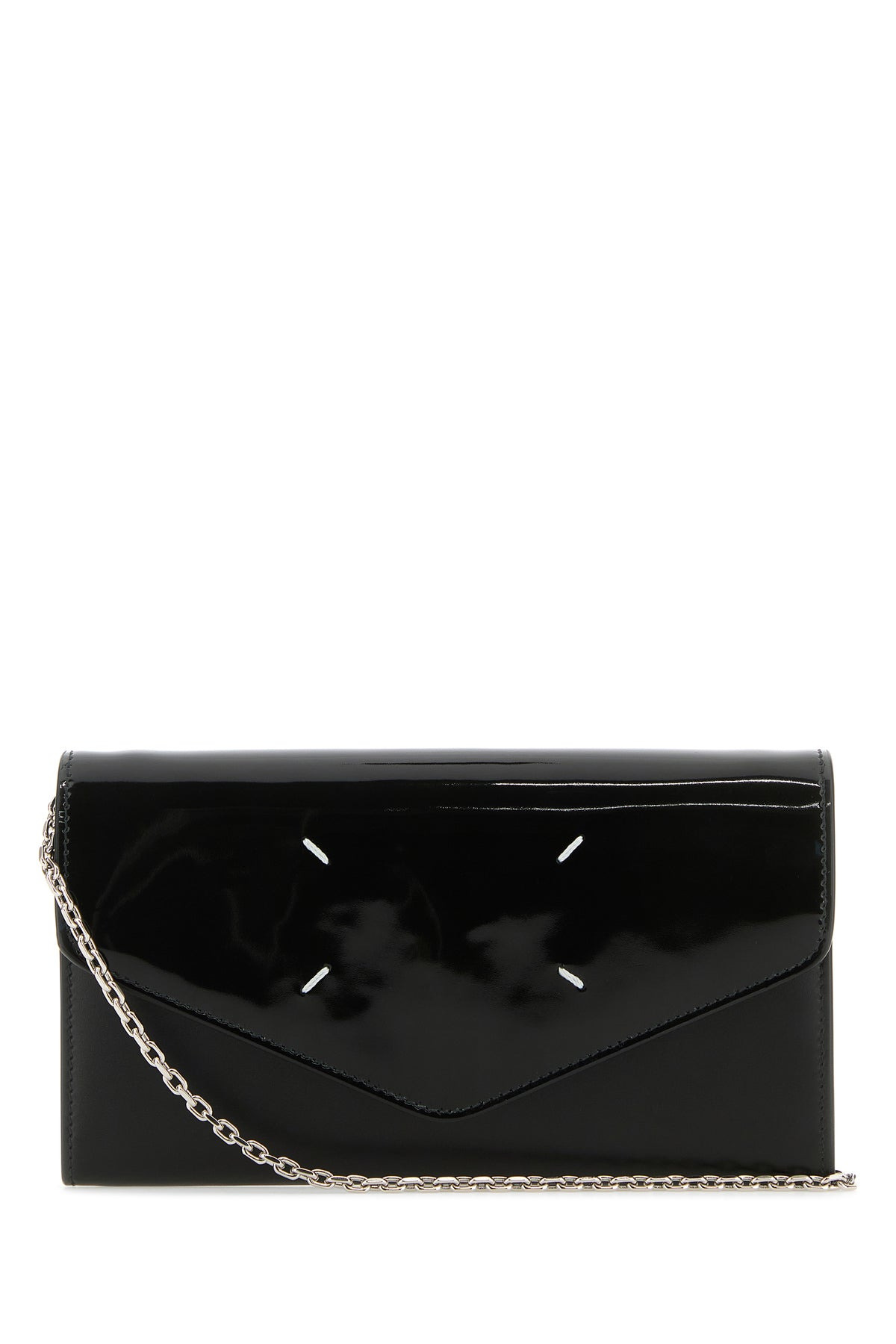 Wallet realized in smooth calf leather with patent calf leather insert characterized by contrasting iconic stitches at the front. - Detachable metal chain shoulder strap with leather shoulder pad - Magnetic button closure under the flap - A slit pocket at the back - Interior with a coin pocket, a compartment, a slit pocket and six credit card slots DETAILS Exterior: 100% Calf Finishing: Silver metal Made In Italy Width: 19,5 cm Height: 11,5 cm Depth: 2 cm