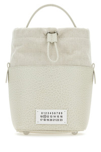 Bucket bag realized in pebble bovine leather and canvas enriched by logoed leather patch at the front. - Detachable tonal leather flat handle - Adjustable detachable metal chain shoulder strap with tonal leather shoulder pad - Drawstring closure - Lined interior with a patch pocket - Protective metal feet at the base DETAILS Exterior: 100% Bovine leather Lining: 100% Fabric Finishing: Silver metal Made In Italy Width: 15 cm Height: 22 cm Depth: 12 cm Handle height: 8 cm Min shoulder strap length: 49 cm Max shoulder strap length: 58 cm