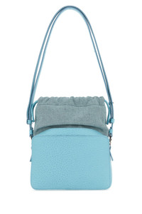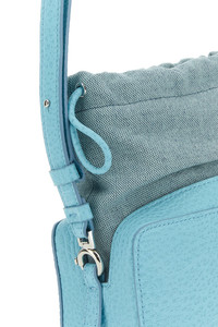 Bucket bag realized in pebble bovine leather and fabric enriched by contrasting leather logoed label at the front. - Adjustable tonal leather shoulder strap - Drawstring closure - Lined DETAILS Excterior: 100% Bovine leather 79% Cotton 15% Polyester 6% Other fibers Lining: 100% Cotton Finishing: Silver metal Made In Italy Width: 20 cm Height: 13 cm Depth: 8 cm Min shoulder strap length: 23 cm Max shoulder strap length: 45 cm