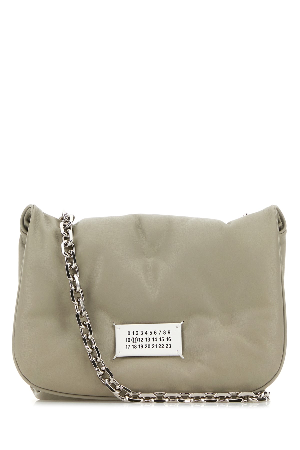 Crossbody bag realized in nappa enriched by contrasting logoed label at the front. - Metal chain shoulder strap with leather shoulder pad - Automatic buttons closure under the flap - A slit pocket under the flap - Lined DETAILS Light grey nappa leather small Glam Slam Flap crossbody bag Exterior: 100% Nappa leather Lining: 100% Fabric Finishing: Silver metal Made in italy Width: 21 cm Height: 16 cm Depth: 6 cm Shoulder strap length: 58 cm