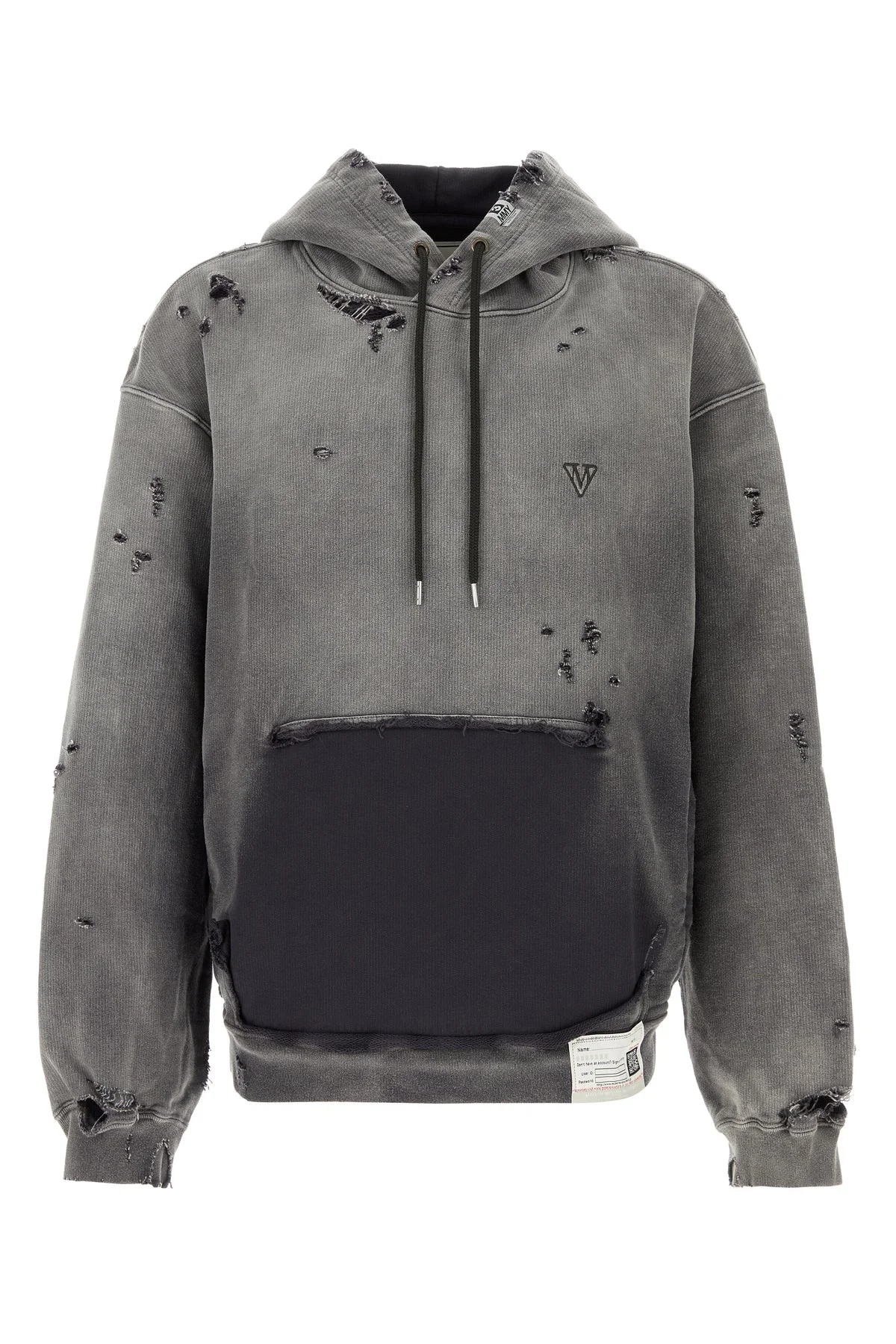 Oversize sweatshirt realized in stonewashed pure cotton with intentional rips characterized by tonal embroidered logo on the chest enriched by logoed label on the hood and on the hemline. - Drawstring hood - Decorative pocket at the front - Ribbed cuffs and hemline DETAILS Black cotton oversize sweatshirt Exterior: 100% Cotton Made in japan Sample size: 48