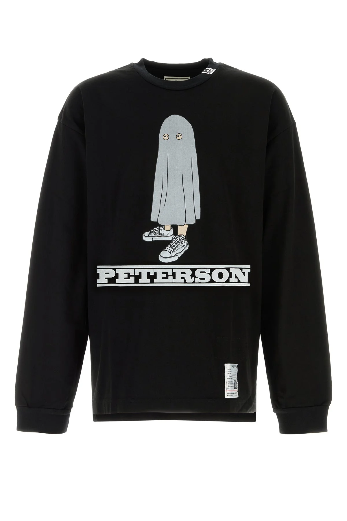 Long-sleeve oversize t-shirt realized in pure cotton characterized by Peterson print at the front enriched by logoed labels at the neck and on the hemline. - Ribbed crew-neck and cuffs - Lateral slits on the hemline - Slightly longer back DETAILS Black cotton oversize t-shirt Exterior: 100% Cotton Made in japan Sample size: 48