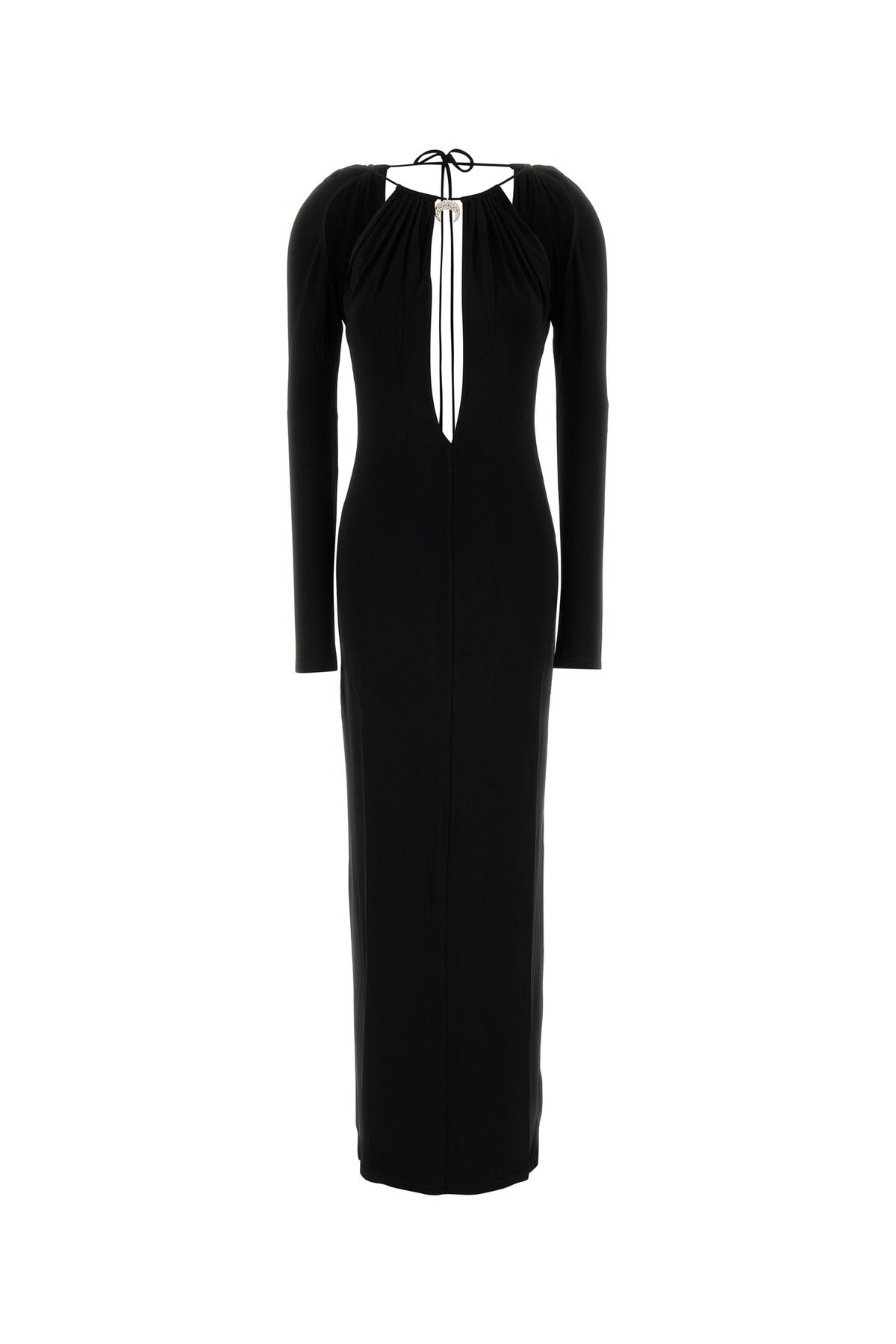 Long dress realized in jersey enriched by Moon metal detail at the front. - Deep neckline at the front - Backless - Laces to tie closure at the top - Cut-out detail at the top - Central slit at the back - Unlined DETAILS Black jersey long dress Exterior: 95% Viscose 5% Elastane Made in france Sample size: 38