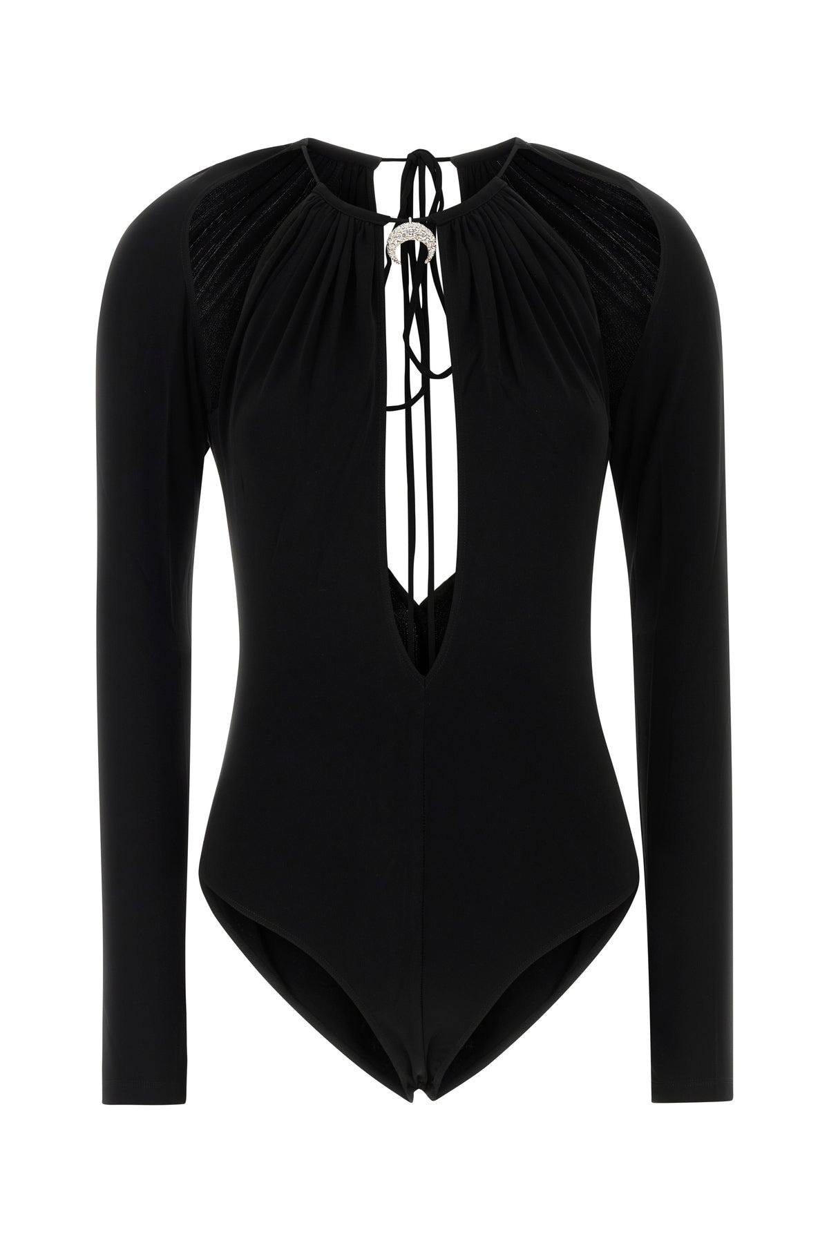 Bodysuit realized in stretch viscose blend enriched by Moon embellished jewel at the top. - Round neckline - Laces to tie closure at the back - Cut-out detail at the front DETAILS Black stretch viscose bodysuit Exterior: 95% Viscose 5% Elastane Made in france Sample size: 38