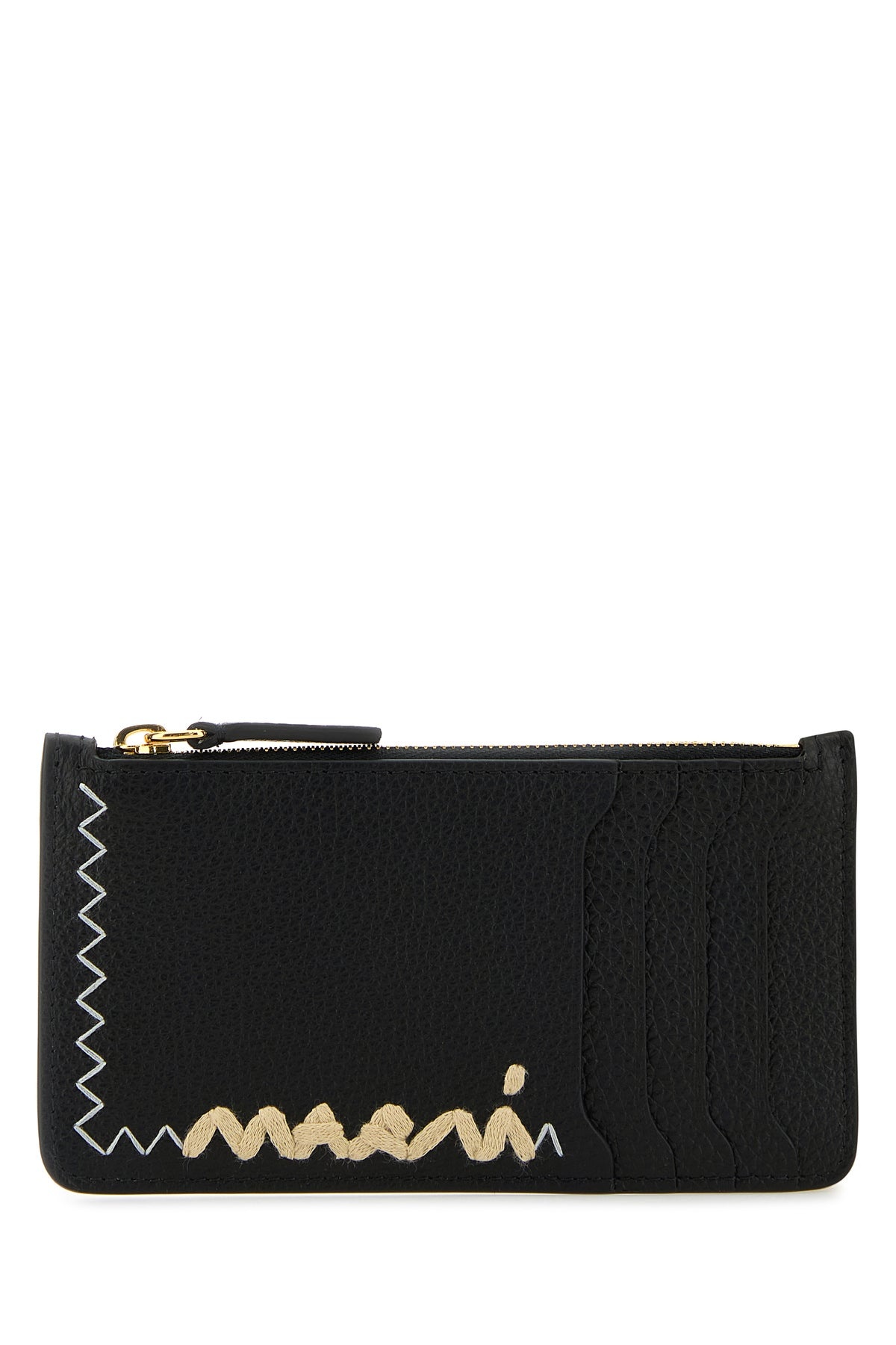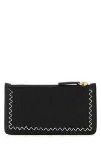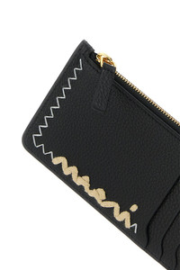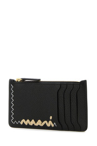 Card holder realized in pebble calf leather characterized by logoed embroidery at the front and contrasting stitchings on the trimmings. - A central zip pocket and four credit card slots DETAILS Black leather card holder Exterior: 100% Calf Finishing: Golden metal Made in italy Width: 6,5 cm Height: 13 cm