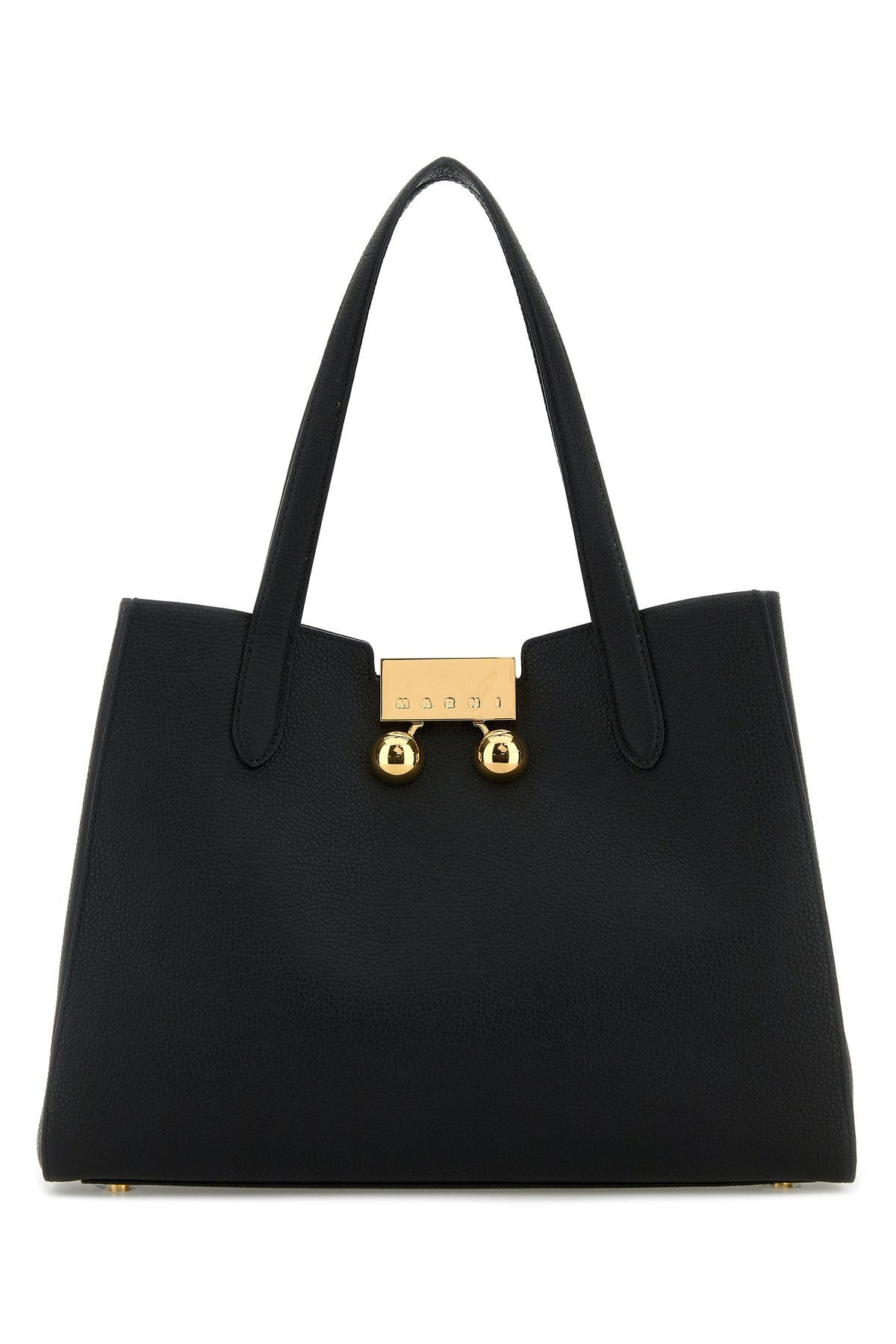Shoulder bag realized in pebble bovine leather characterized by embossed logo on the snap-fit closure. - Two tonal leather flat handles - Lined interior with a zip pocket DETAILS Black leather Trunkaroo shoulder bag Exterior: 100% Bovine leather Lining: 100% Bovine leather Finishing: Golden metal Made in italy Width: Height: Depth: Handle height: