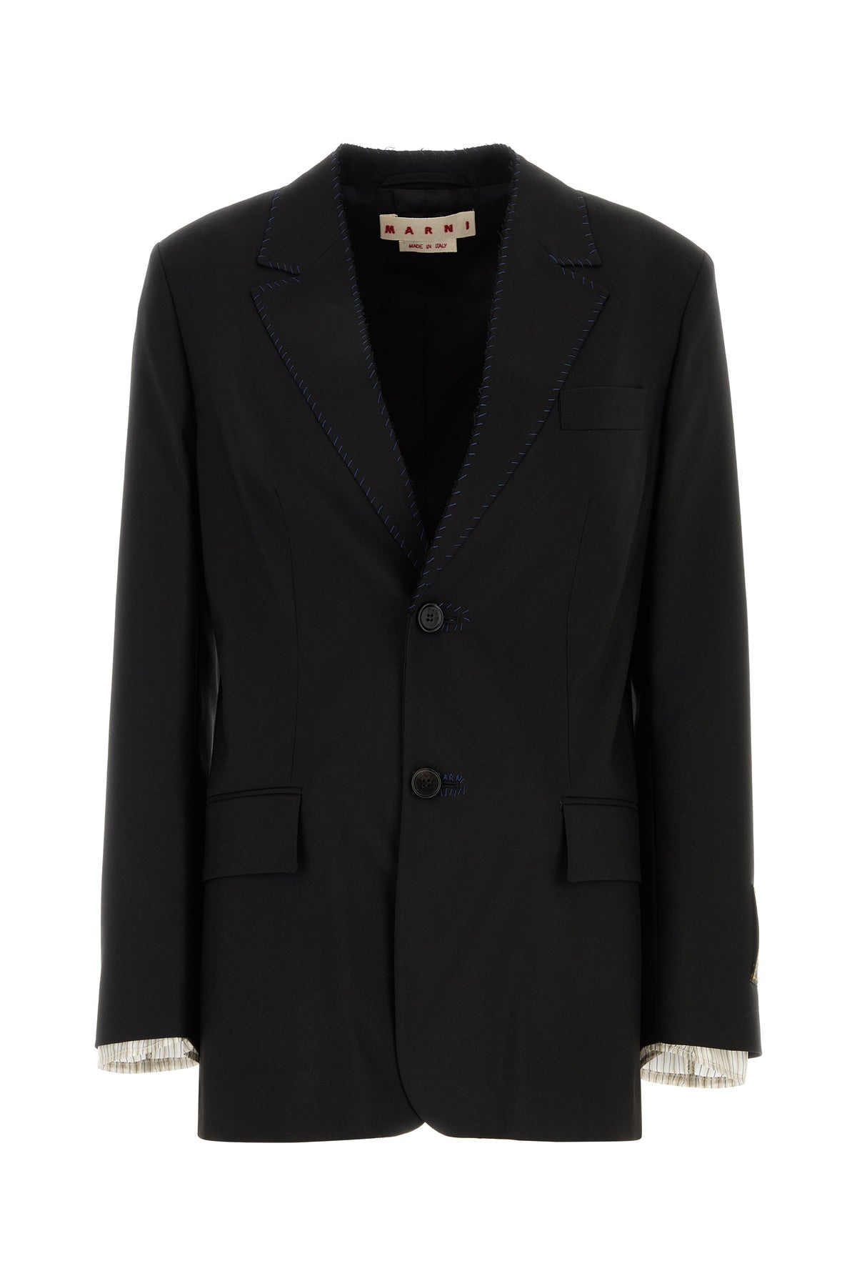 Blazer realized in pure virgin wool enriched by logoed label on the sleeve. - Notched collar - Single-breasted closure by buttons - A chest pocket and two flap pockets at the front - Three buttons on the sleeves - Central slit at the back - Lined interior with a slit pocket DETAILS Black wool blazer Exterior: 100% Virgin wool Lining: 100% Cupro Made in italy Sample size: 38