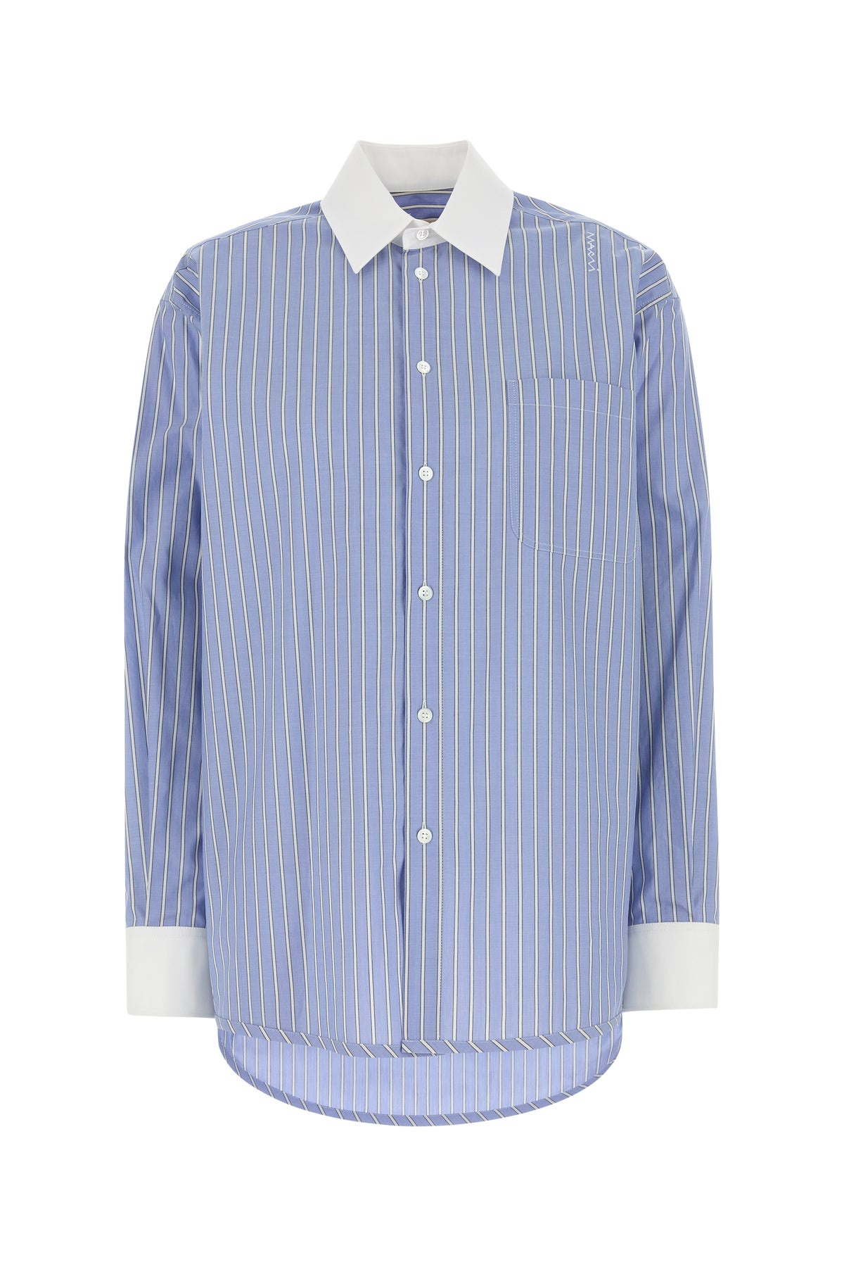 Oversize shirt realized in pure cotton poplin characterized by peculiar striped embroidery on the entire surface and embroidered logo at the top. - Short-pointed collar - Buttons closure - A chest pocket - Rounded cuffs with button - Rear yoke DETAILS Embroidered poplin oversize shirt Exterior: 100% Cotton Made in italy Sample size: 38