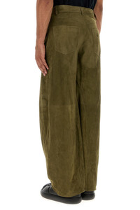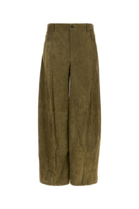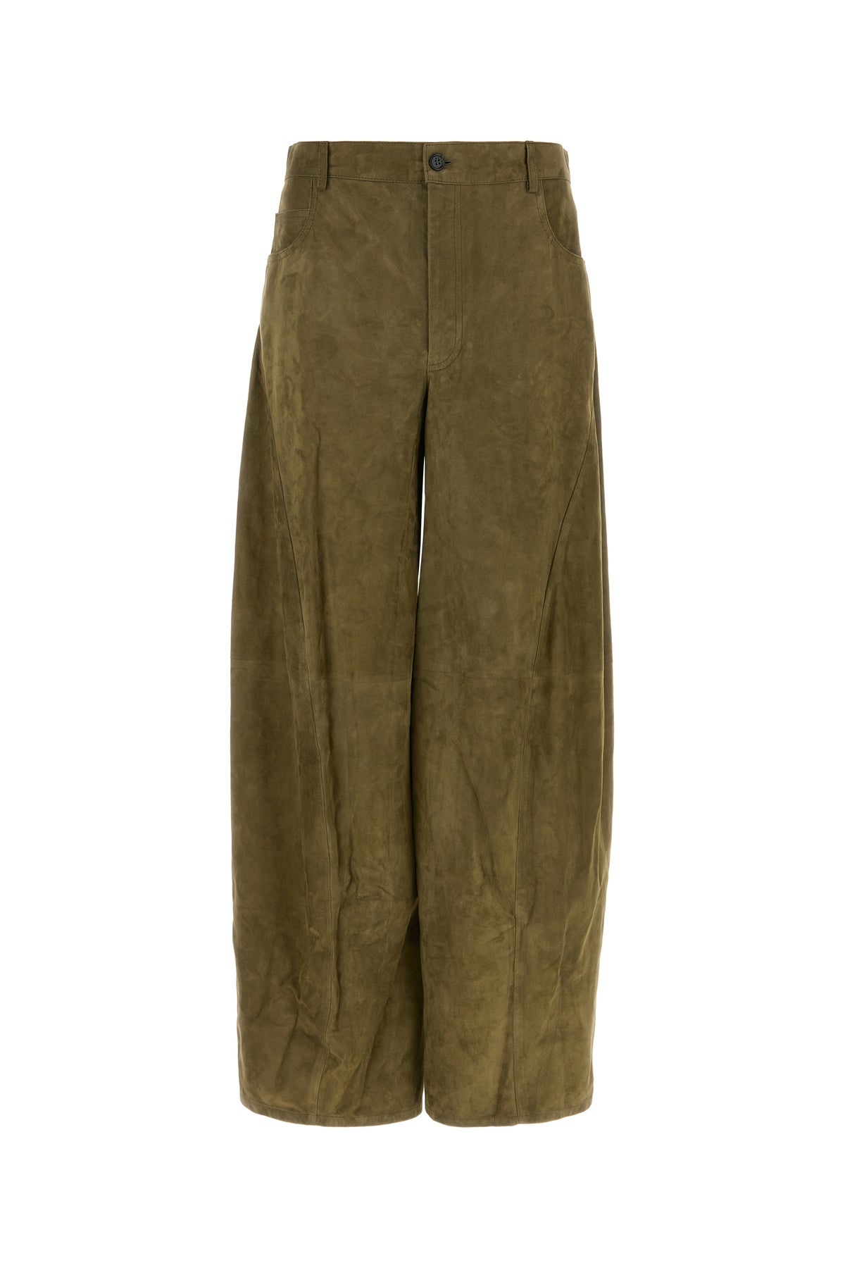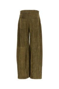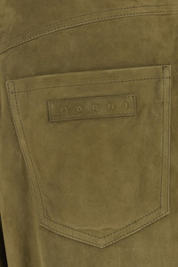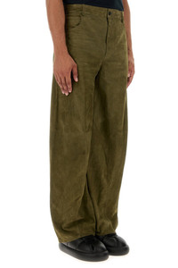 Pant realized in ovine suede enriched by tonal logoed label at the back. - Belt loops at the waist - Concealed zip and single visible button closure - Five classic pockets DETAILS Olive green suede pant Exterior: 100% Ovine leather Made in italy Sample size: 48