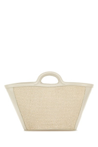 Handbag realized in smooth bovine leather and raffia characterized by contrasting embroidered logo at the front. - Flat leather handles - Adjustable detachable leather shoulder strap - Strap closure - Lined interior with a zip pocket DETAILS White leather and raffia small Tropicalia Summer handbag Exterior: 52% Cotton 48% Nylon 100% Bovine leather Lining: 100% Cotton Made in italy Width: 24 cm Height: 20 cm Depth: 20,5 cm Handle height: 3,5 cm Min shoulder strap length: 51 cm Max shoulder strap length: 54 cm