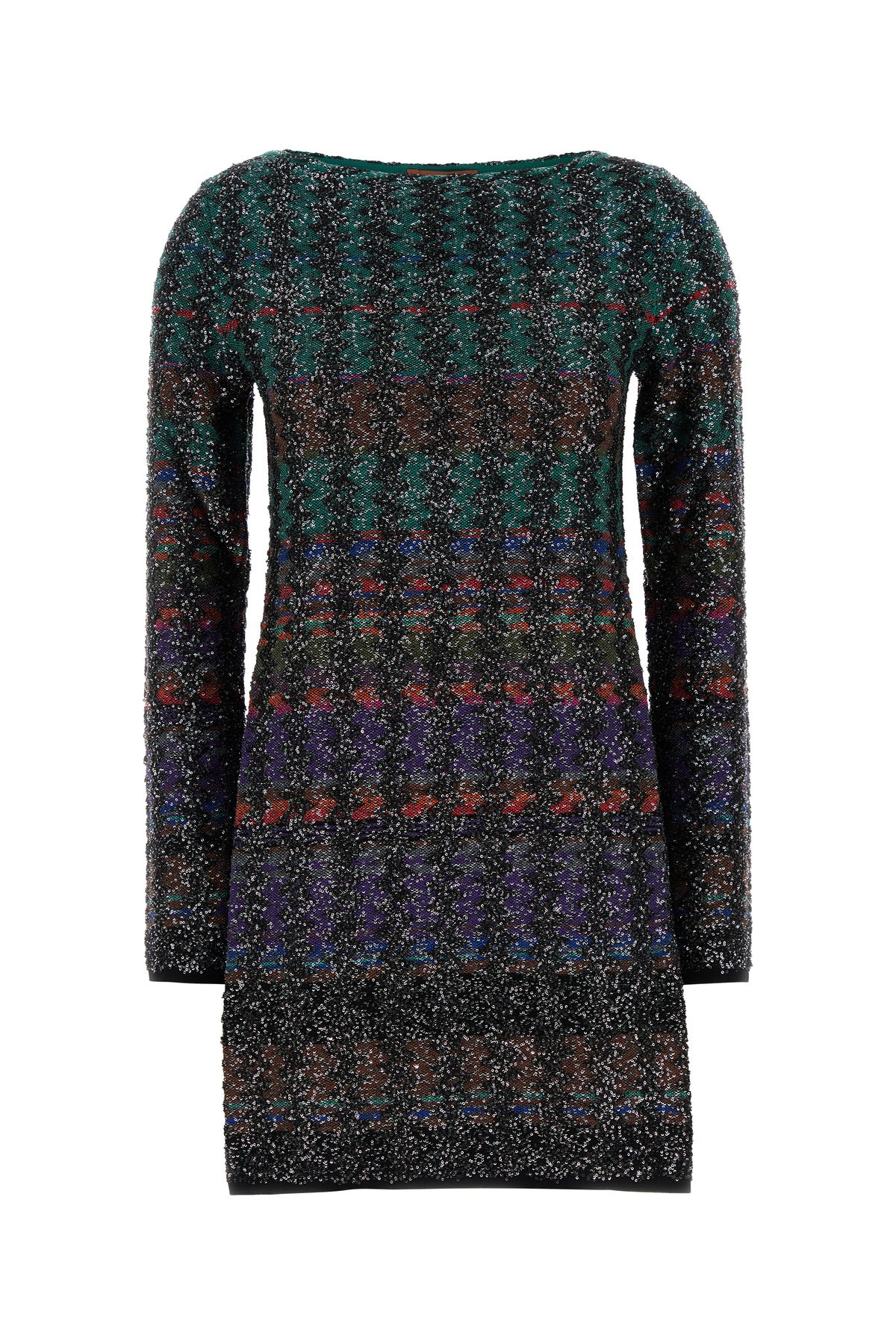 Fitted mini dress realized in knit with lurex threads characterized by geometric embroidery on the entire surface enriched by sequins. - Boat neckline - Long sleeves - Ribbed cuffs and hemline - Unlined DETAILS Embroidered knit mini dress Exterior: 56% Nylon 31% Viscose 13% Polyester Made in italy Sample size: 38